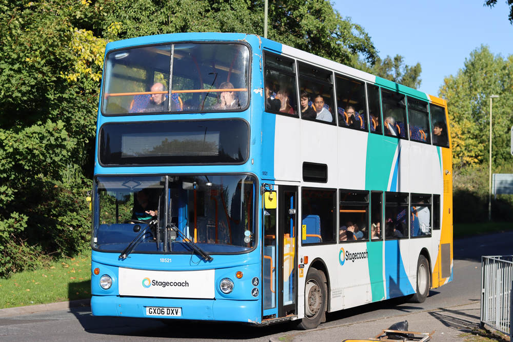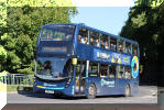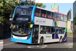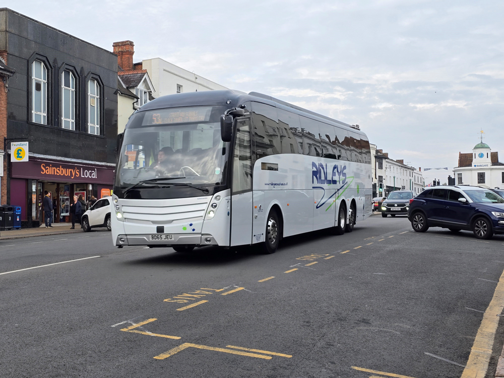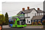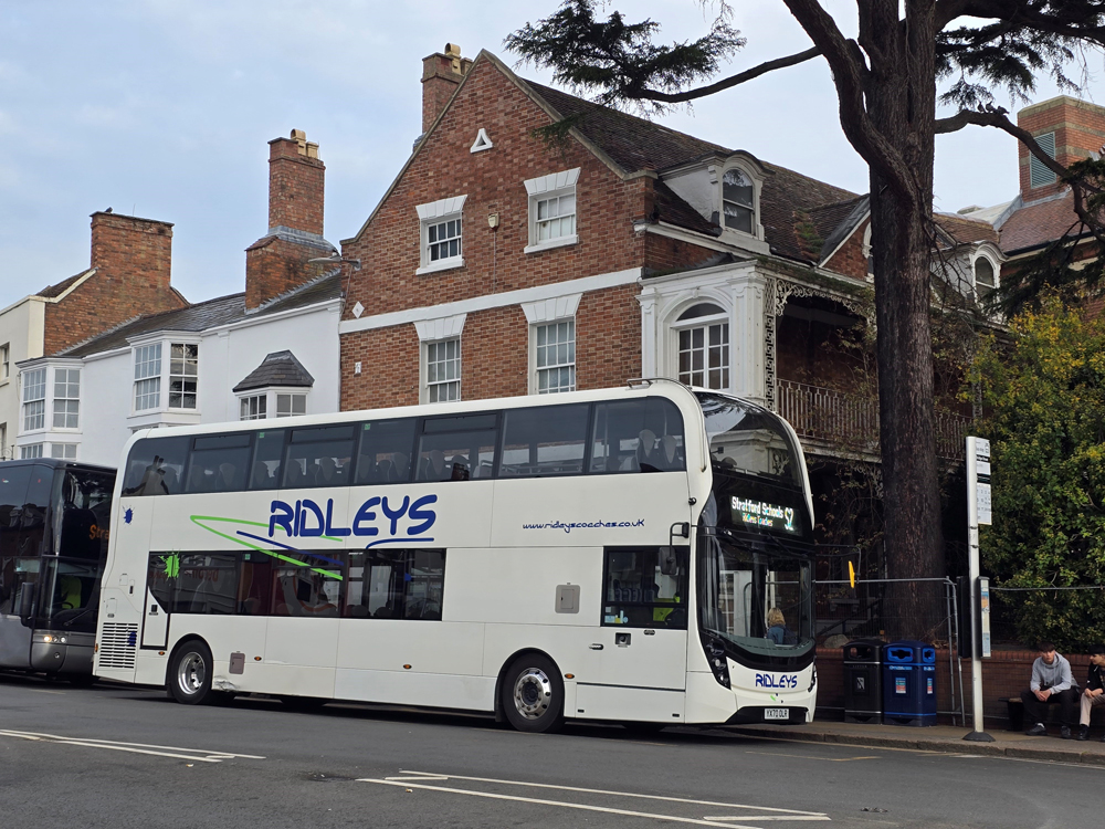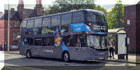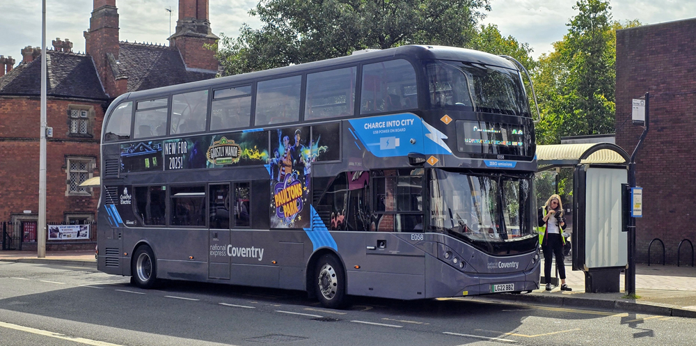 The entire double deck fleet now comprises BYD/Enviro400 vehicles many of which are named. E097 (LG72 DVJ) Charlotte; E133 (LG72 DXD) Martin Hancock and E058 (LG22 BBZ) Jessica are seen here. The latter is in Bedworth, which for many decades was the northern terminal of route 20 before it was extended to Nuneaton in competition with Stagecoach. E133 is named after a former company director as this article explains: