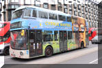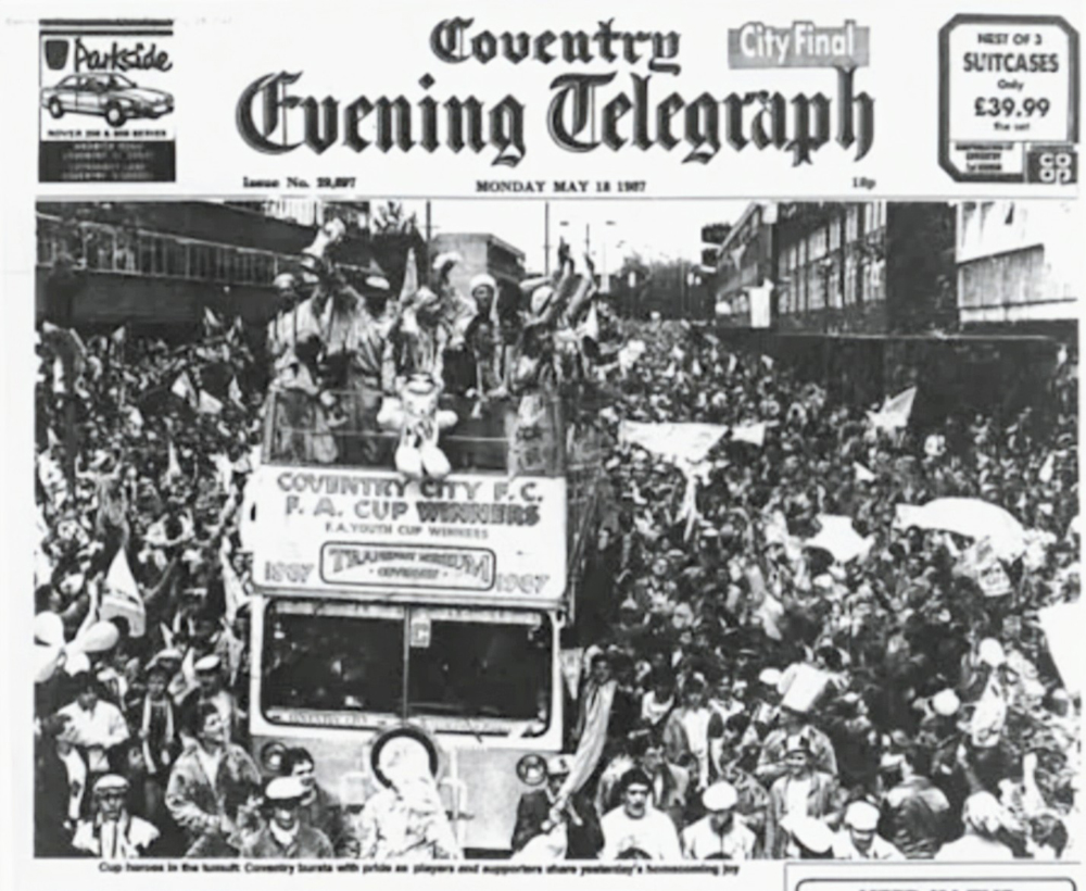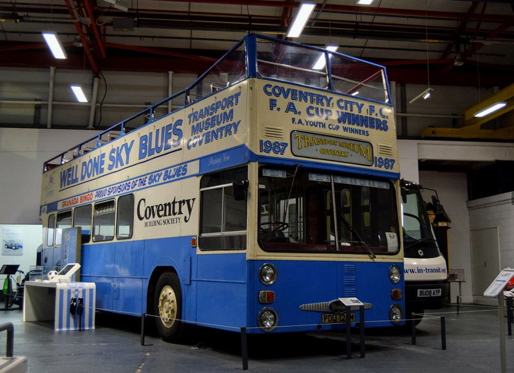 Inside Coventry Transport Museum is a local celebrity known as 'The Sky Blues Bus'. It is the last Daimler Fleetline built in Coventry. Delivered new to Coventry Corporation Transport, 125 (PDU125M) with an East Lancs body was delivered new in September 1973, seven months before the fleet was absorbed into West Midlands PTE. It was controversially converted to open top after allegedly receiving roof damage which some sources dispute. It was famously used to transport Coventry City Football Club after they won the FA Cup in 1987 as the front page of the Coventry Evening Telegraph dated May 18th 1987 shows.
