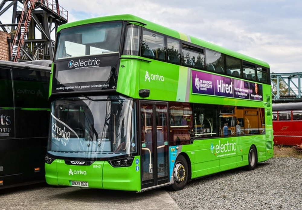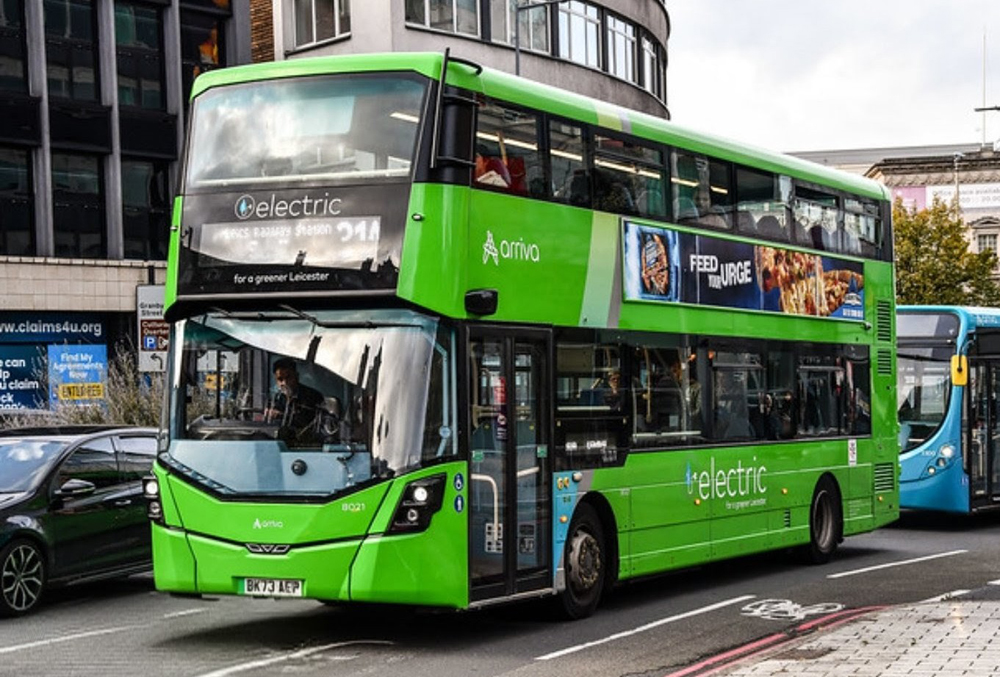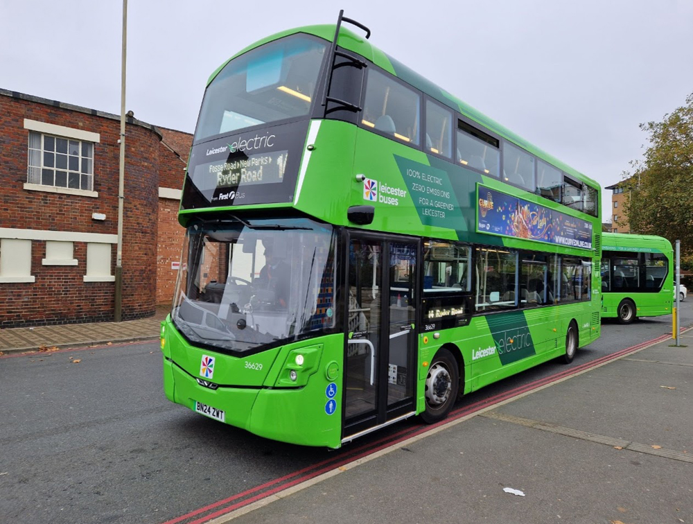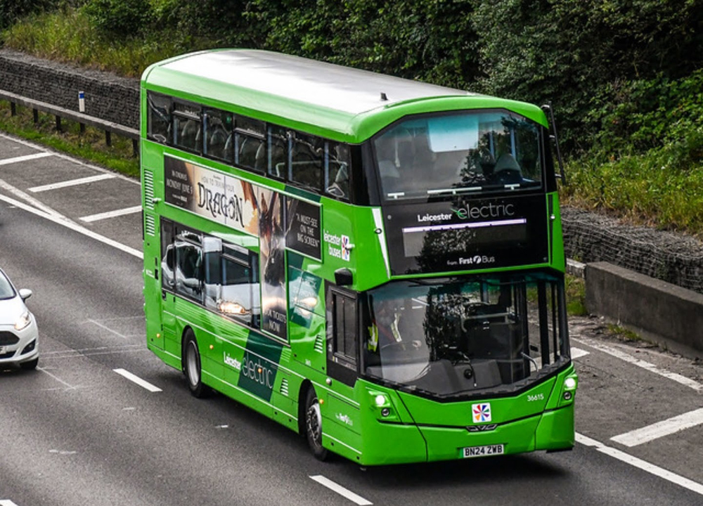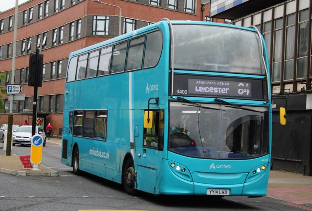 In contrast, a variety of standard liveried buses can be seen on Leicester route