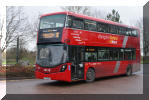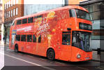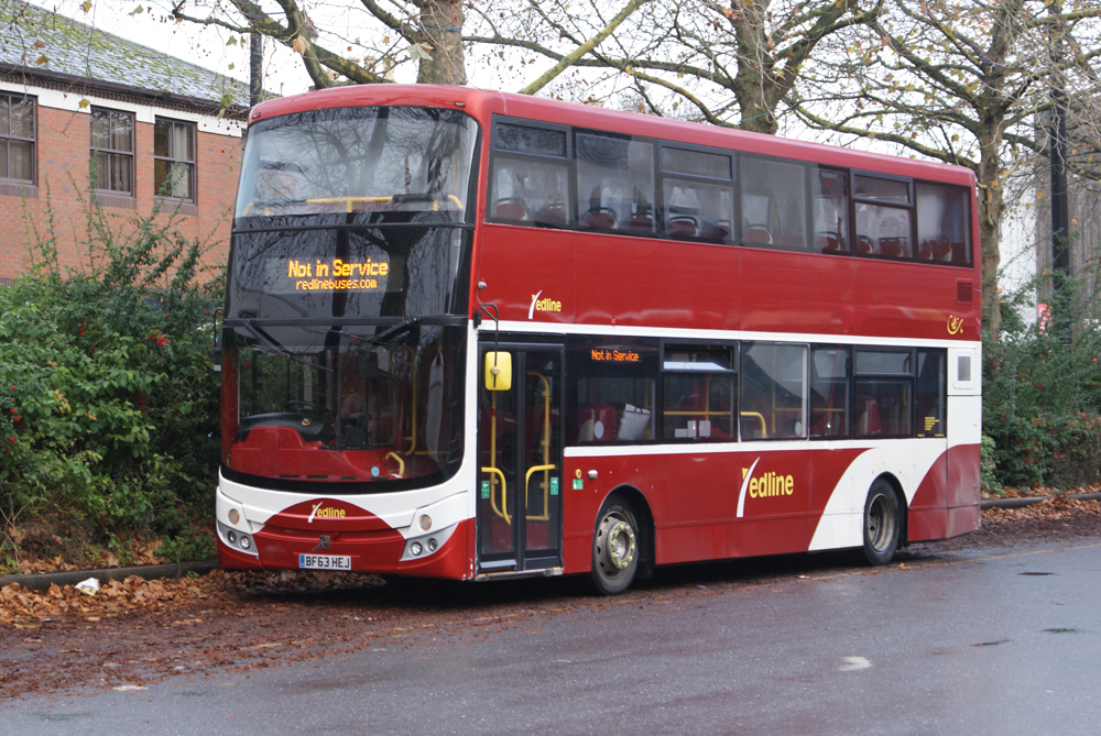 a new double decker in rich red turning out of Iffley Turn into Henley