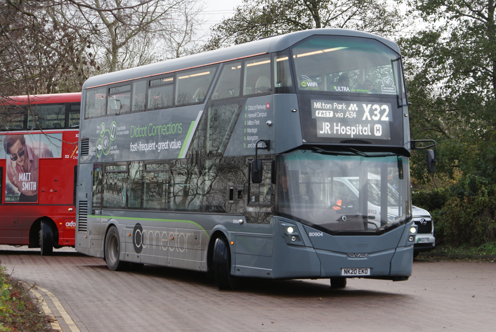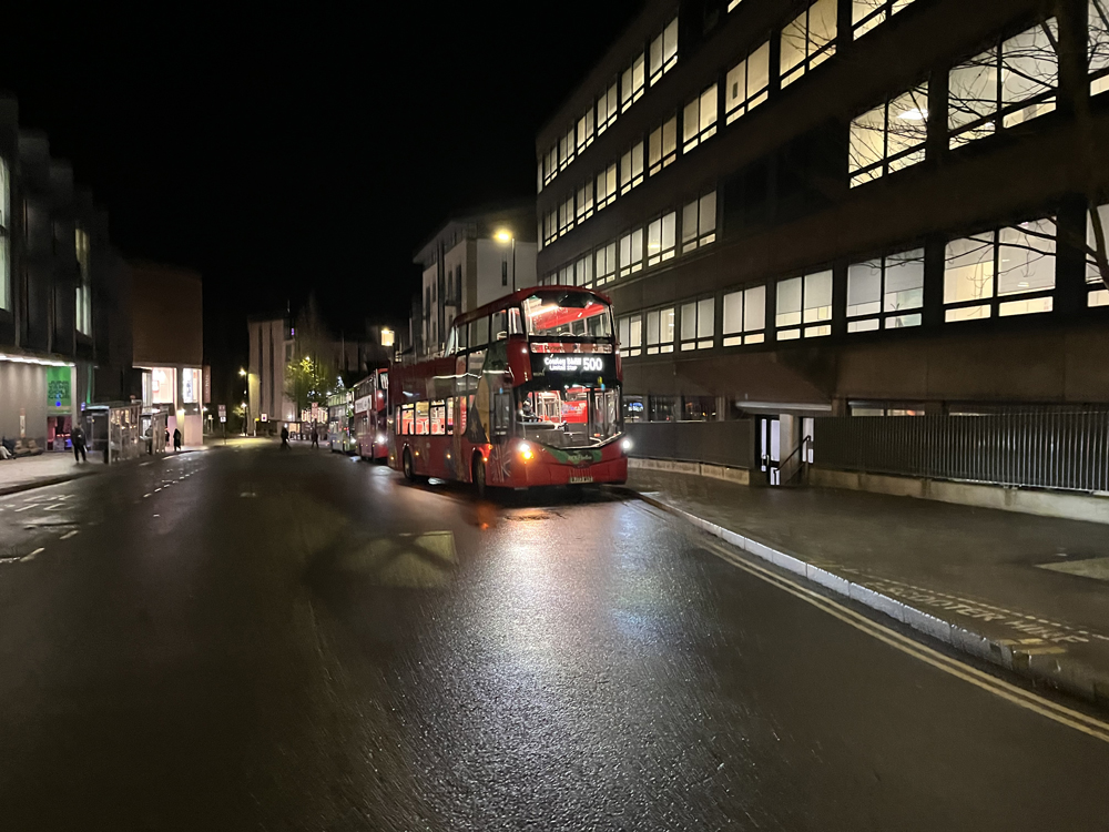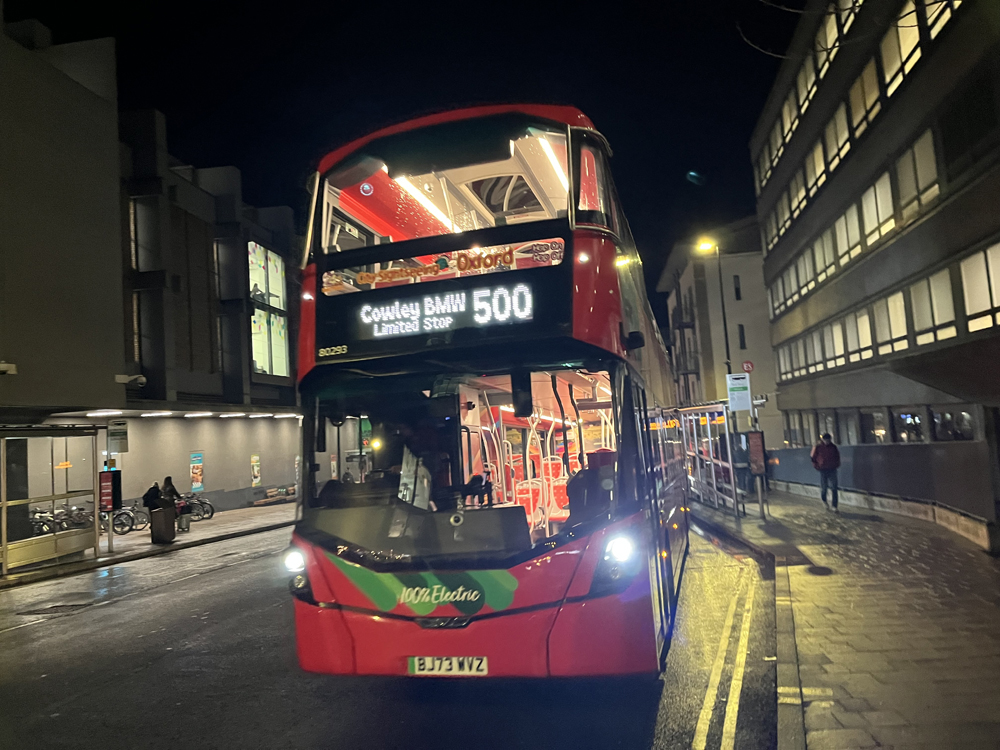 it is the evening of Monday 24th November, I’m in Oxford, and it is dark, freezing cold and drizzling rain. And yet, what is tonight running on the 500 limited-stop high-speed service, but an open-top bus. Sorry about the two poor pictures, but my hands were numb with the cold.”
