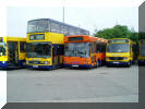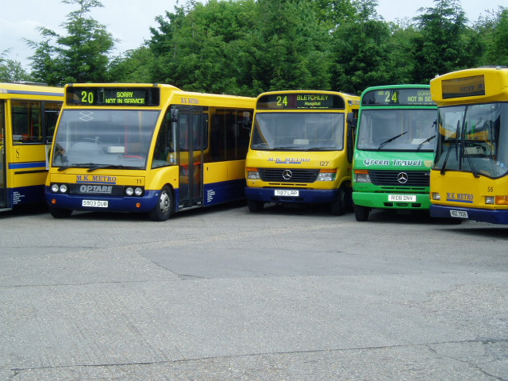 Buckinghamshire Roadcar (green livery), Milton Keynes Citybus (red livery) and