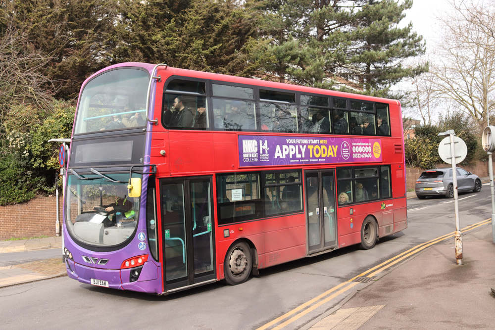 The company also run a selection of former London double deckers which have had the front and rear repainted purple, seemingly as a promotion for North Kent College.