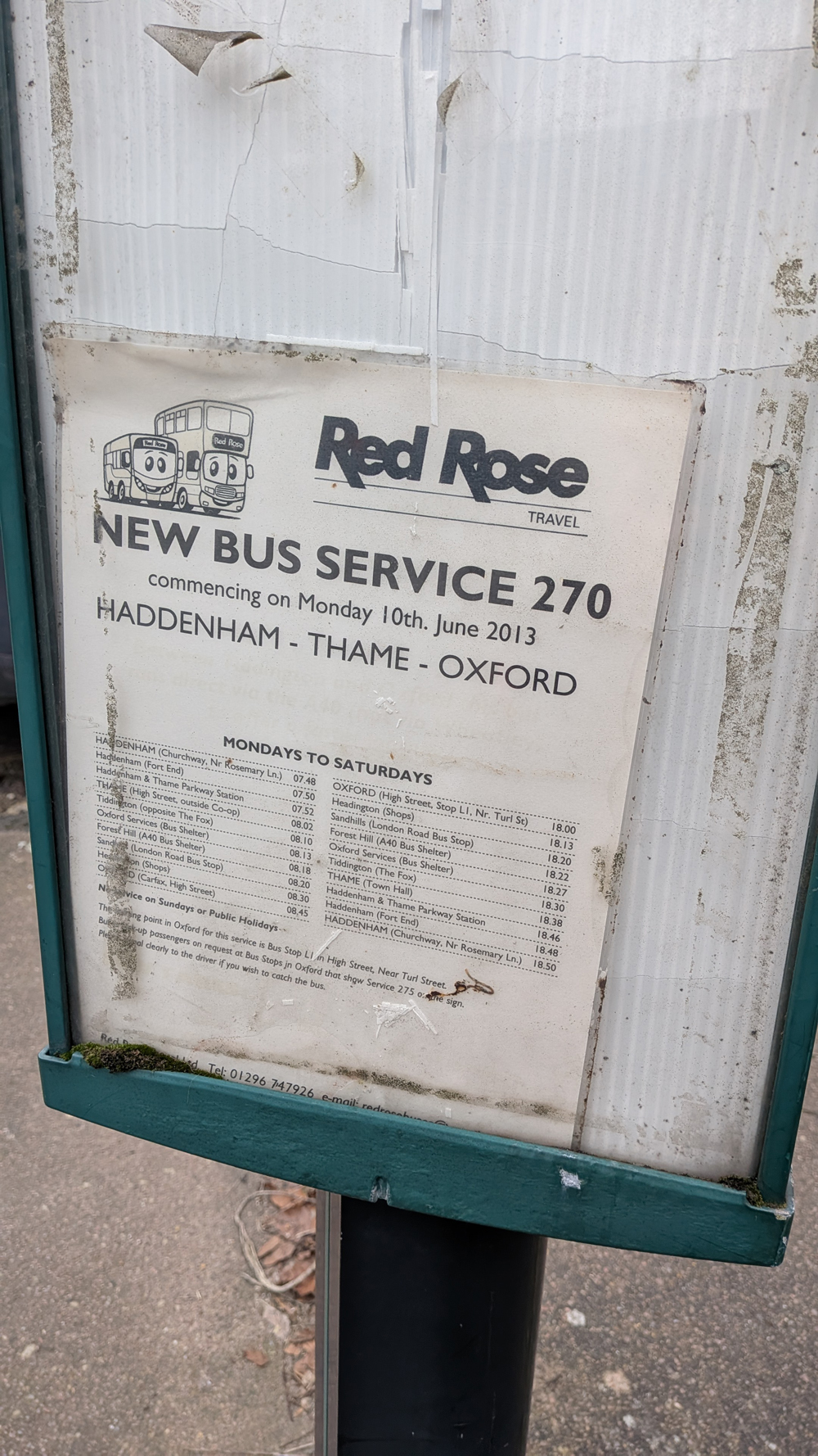 I have attached to this email a photo of an old-ish timetable for a bus route that I hadn't heard of before that I saw whilst walking through Thame the other day and I was wondering if any of your readers had any more information on it. It was the route 270 ran by Red Rose seemingly and just seems like a very intriguing route as I believe it starts in Haddenham and skips Wheatley? Almost like a combination of the old X20 route and the old 280 route. It is also seemingly fascinating that this original timetable poster is still up to this day considering it apparently started almost 13 years ago!
