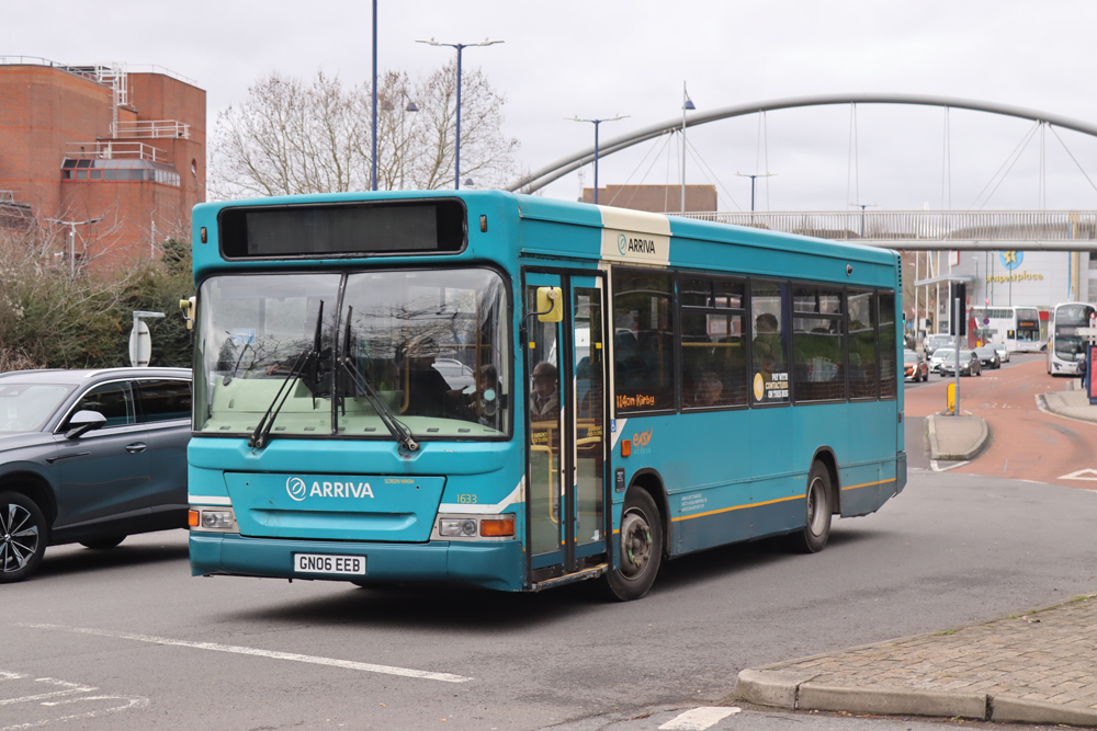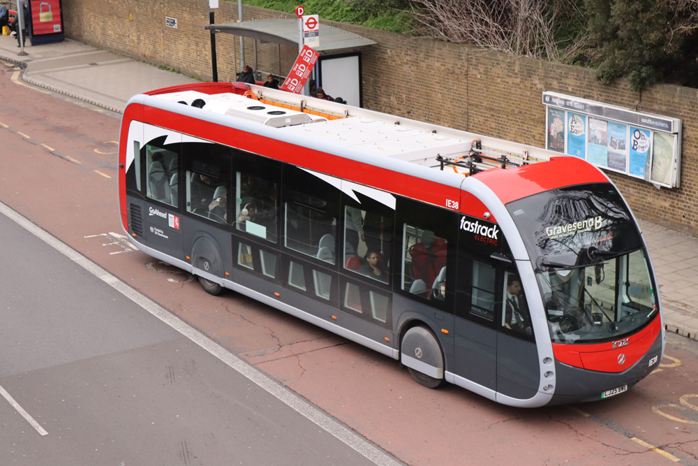 Go Ahead's profile in the area expanded considerably on 10 November 2024 when the company started a 15 year contract to operate Fastrack bus rapid transit network. Over a year later and the intended Irizar ie Tram buses ordered are operating a greater proportion of services. IE38 is a typical example, viewed from the footbridge crossing Home Gardens to give a clear view of the rooftop bars which allow opportunity charging at each end of the route. Issues getting these charging stations operational have limited the number of buses able to run in service.