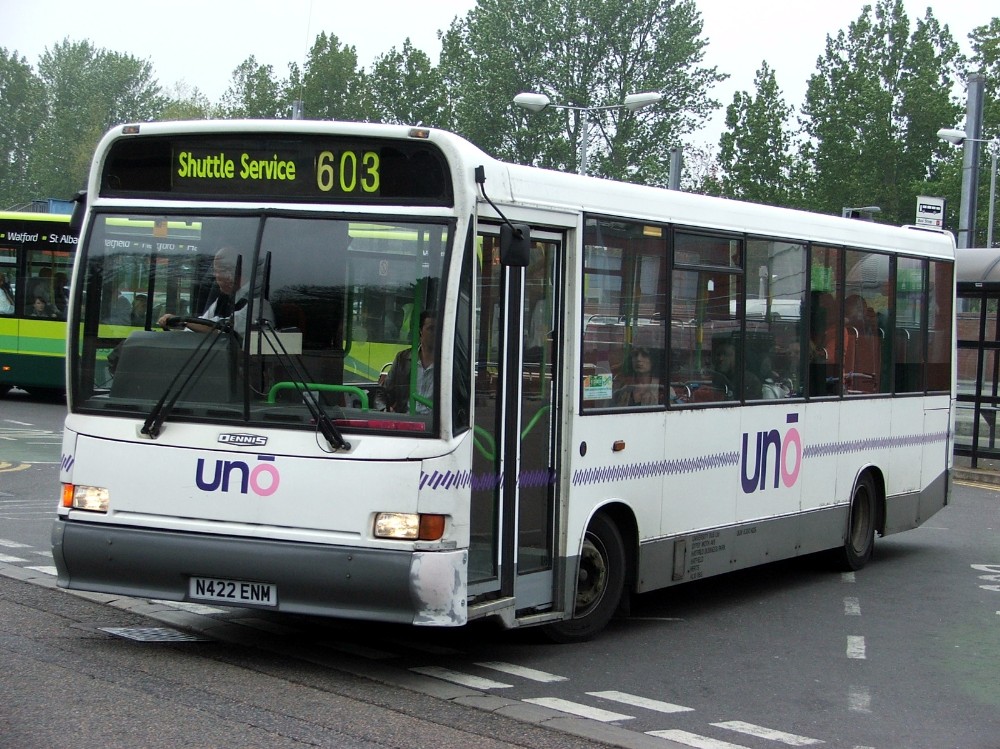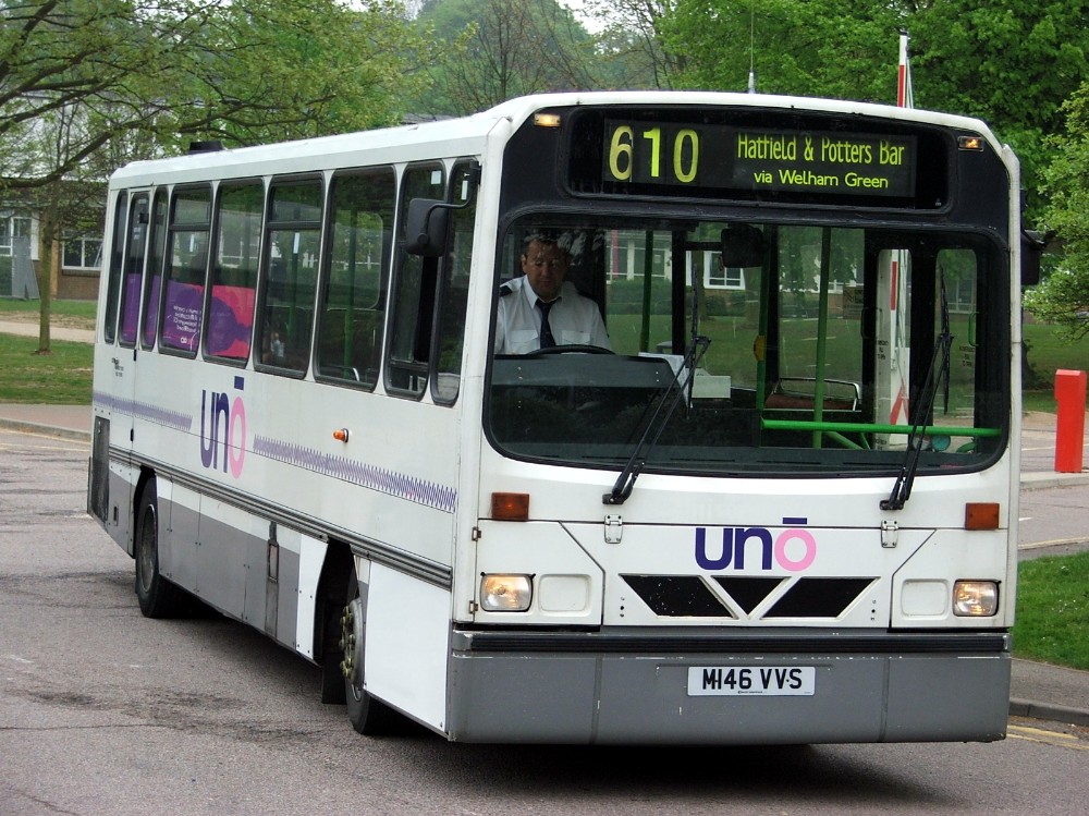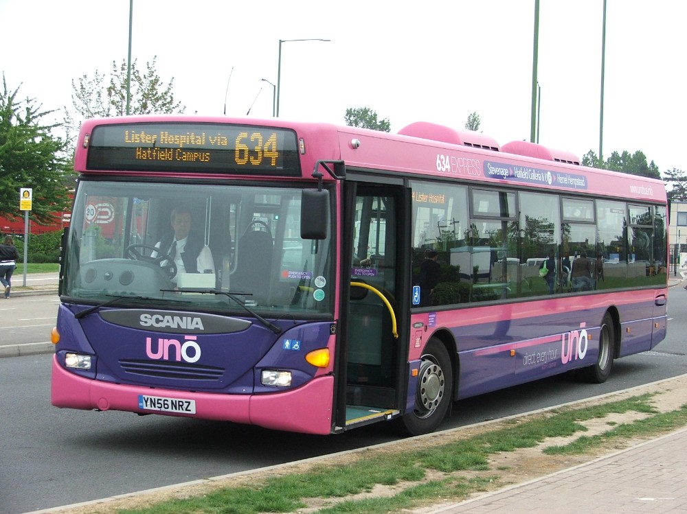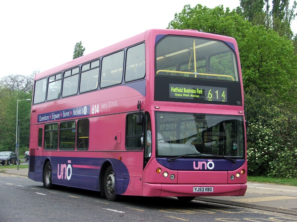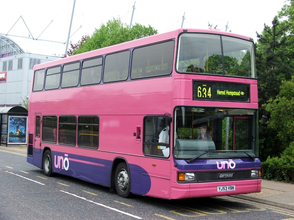 Hatfield is dominated by Uno Bus which has developed from University Bus and which I believe operated some American Bluebird buses in the early days of its existence. Ray Stenning of Best Impressions devised the striking livery which is certainly colourful to say the least. Very few buses remain in the original white and grey livery. The Galleria, which can be seen from the A1M is also served by Arriva and Centrebus.