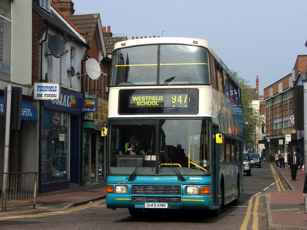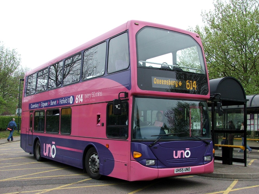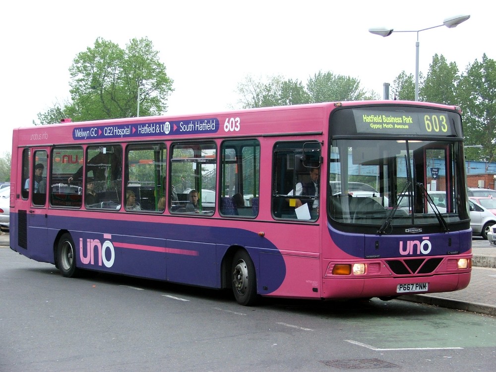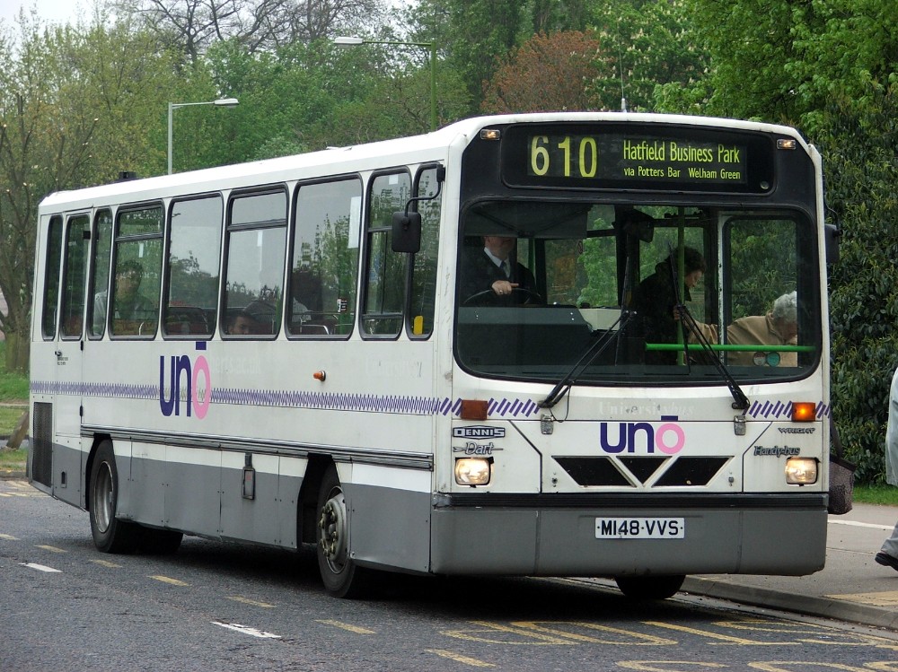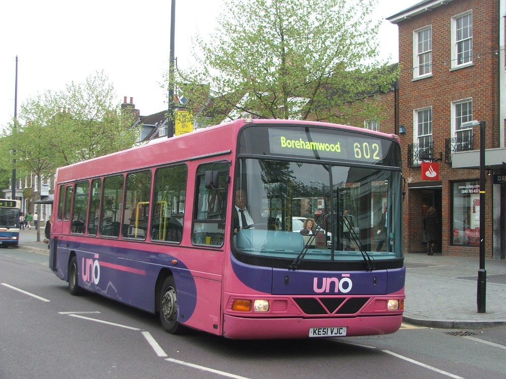 Hatfield is dominated by Uno Bus which has developed from University Bus and which I believe operated some American Bluebird buses in the early days of its existence. Ray Stenning of Best Impressions devised the striking livery which is certainly colourful to say the least. Very few buses remain in the original white and grey livery. The Galleria, which can be seen from the A1M is also served by Arriva and Centrebus.