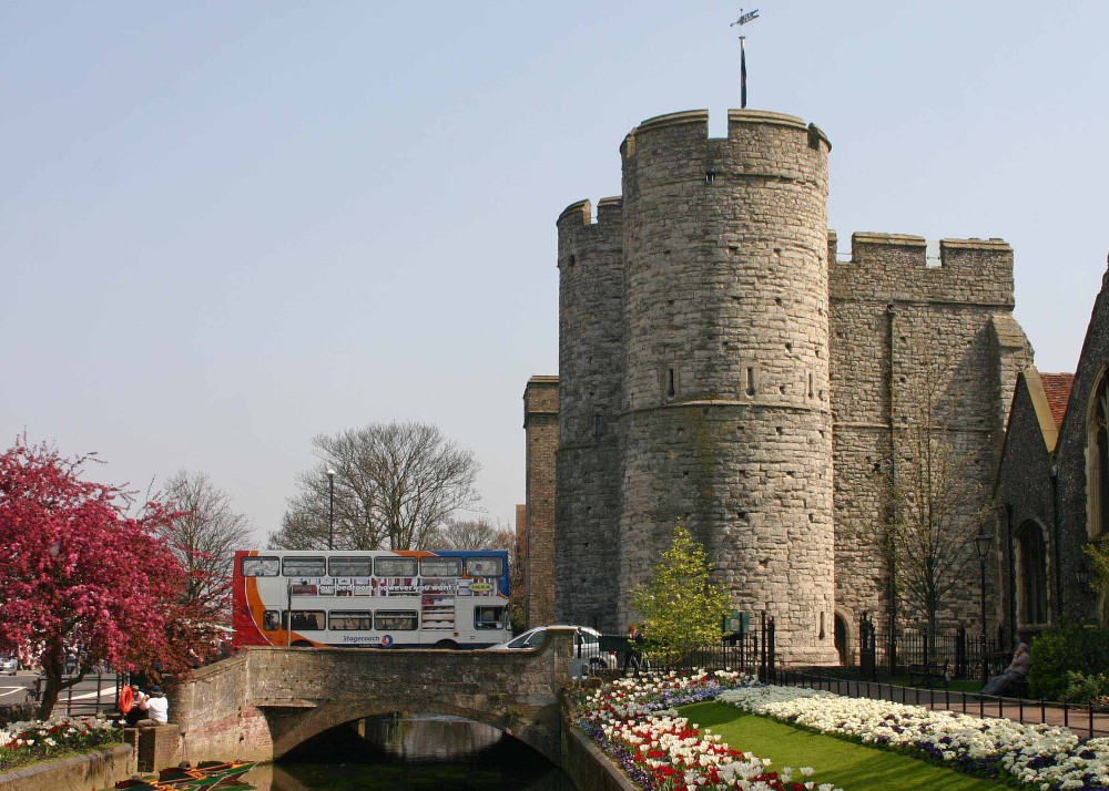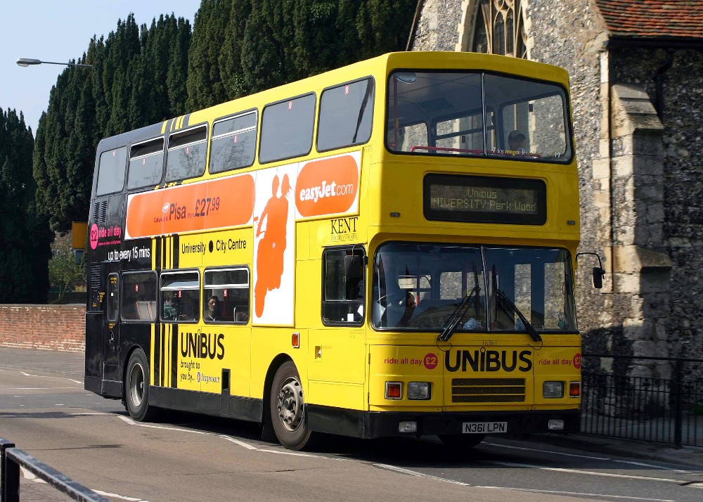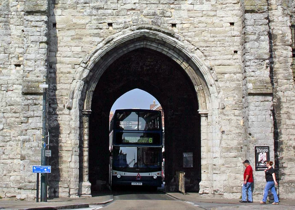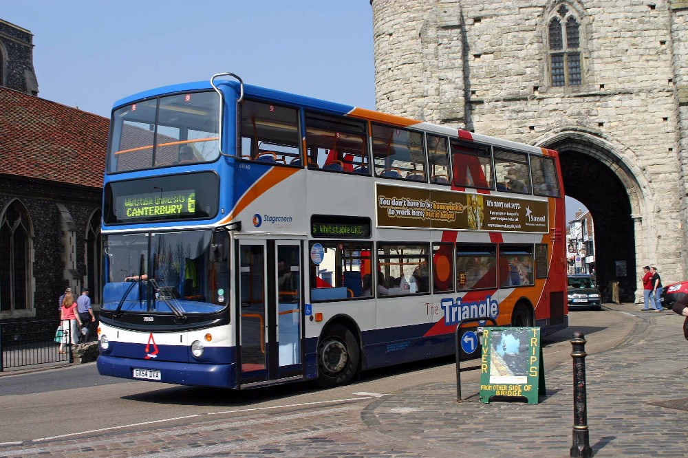 Colin Cooke writes "As a history student at University of Kent, my son is always telling me how much he likes the bus journey into Canterbury and the entrance into the City via the West Gate tower! The tower has stood for six centuries and negotiating through it represents a good skills test for the local Stagecoach drivers ! As you can see from my photos the wing mirrors only just make it!!!!! Not to be taken at speed. I have also included a shot of the UNIBUS which operates to/from the University."