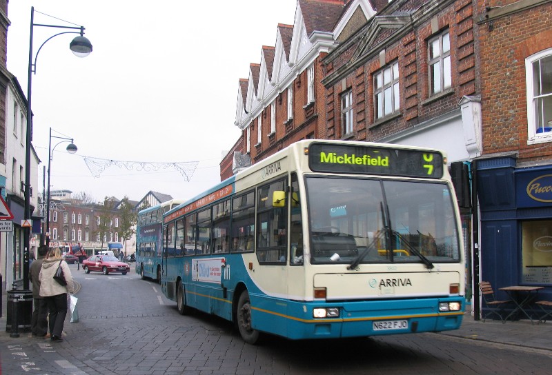 Two local Arriva buses passing through the bus only road in the centre of High