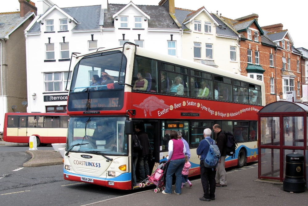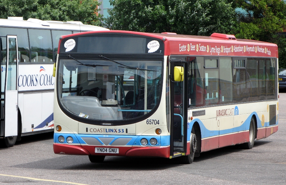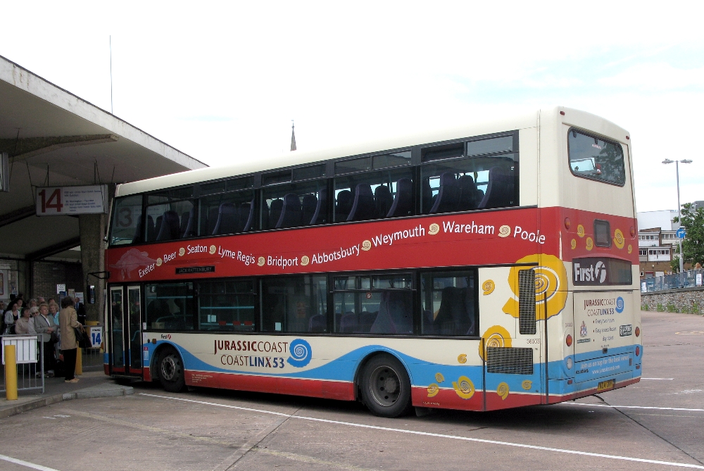 Service X53 - Bridport to Exeter - First Scania N94UD/East Lancs Omnidekka NC43/26F 36003 from 2004.