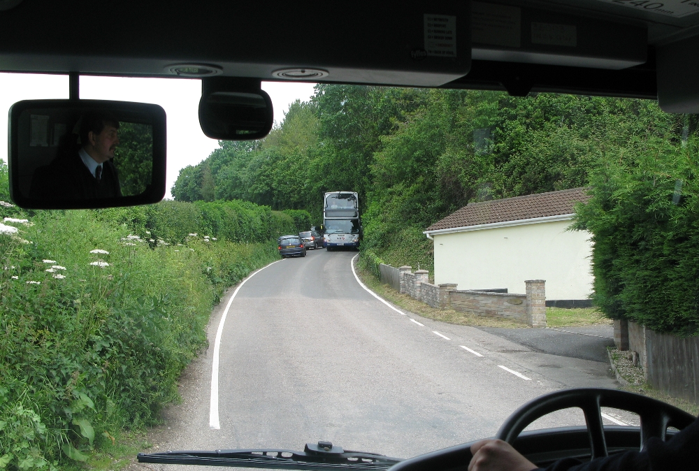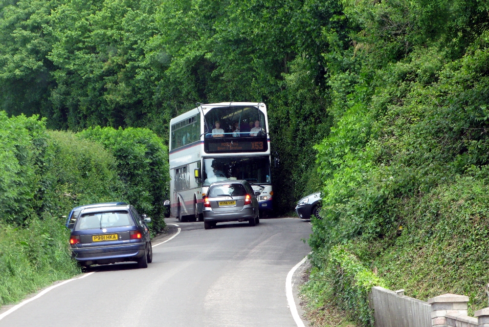 As mentioned in the picture captions the road into Lyme Regis has a very tight right hand bend before one can reach the stop at Rock Point. Our driver told me how easy it was to lose a mirror if you got it wrong and buses of any greater length would, I think, find it too sharp a turn.