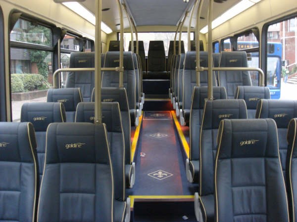 The emphasis is very much on 'Goldline' rather than 'Stagecoach' - note the use of metallic paint. A welcoming touch - the first thing you see on boarding is this on the sound-deadening flooring."