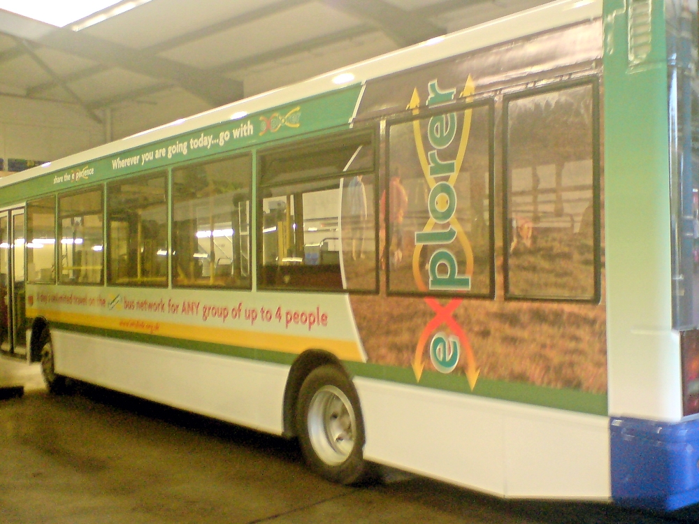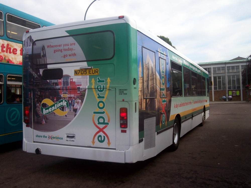 "Hemel Hempstead based Scania 3155 (N705EUR) has been freshly outshopped in an overall advertising livery for the Intalink Explorer. It has also gained interurban livery at the front. I attach two photos of this showing two profiles of the vehicle."