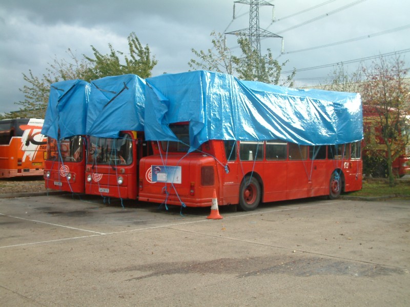Kevin Stevens writes "...attached are 2 photos of 3 of our CSS buses who have been put into hibernation for the winter. They are Fl No 217, 14 and 129. The tarpaulins have been put over them like tents to preserve the top decks from rain etc. It is planned to return them to service on or about 1st April 2006 if required.