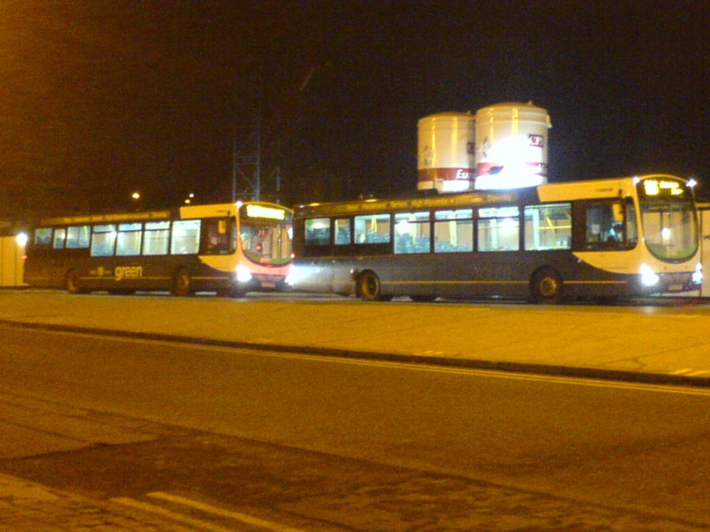 Frazer Peddle writes saying "I took this picture for use on the OCBP. It shows Temple Street, High Wycombe town centre, on the evening of Tuesday 14th March. The Wright Eclipse in front is on the 326 route to Micklefield, the other is on the 315 heading for Lane End both wear the Green route livery, sorry the image isn't great but this was taking on my mobile phone whilst on my way home from work in the dark".