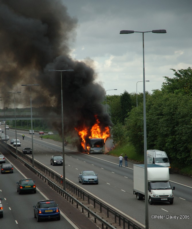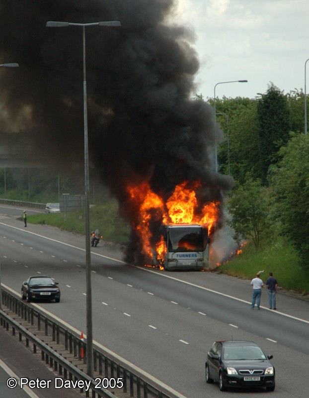 The coach was owned by Turners of Bristol who have a large and quite interesting fleet. The coach involved appears to be a Volvo B10M-62 with Plaxton Premier C57F bodywork, registered P16CJT. It was damaged, to my eyes, quite beyond any repair. Quite what it was doing on the M40 rather the M4 is not clear.