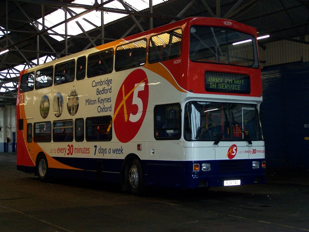Richard Sharman sent some pictures of an Olympian from Bedford which has received X5 branding. Who will send the first picture of this bus in Oxford? Richard writes "Seen fresh out the paint shop this afternoon is 16209,R34 TAC which is branded for the X5 for a 2 month trail. It has also been fitted out with a bike rack!"