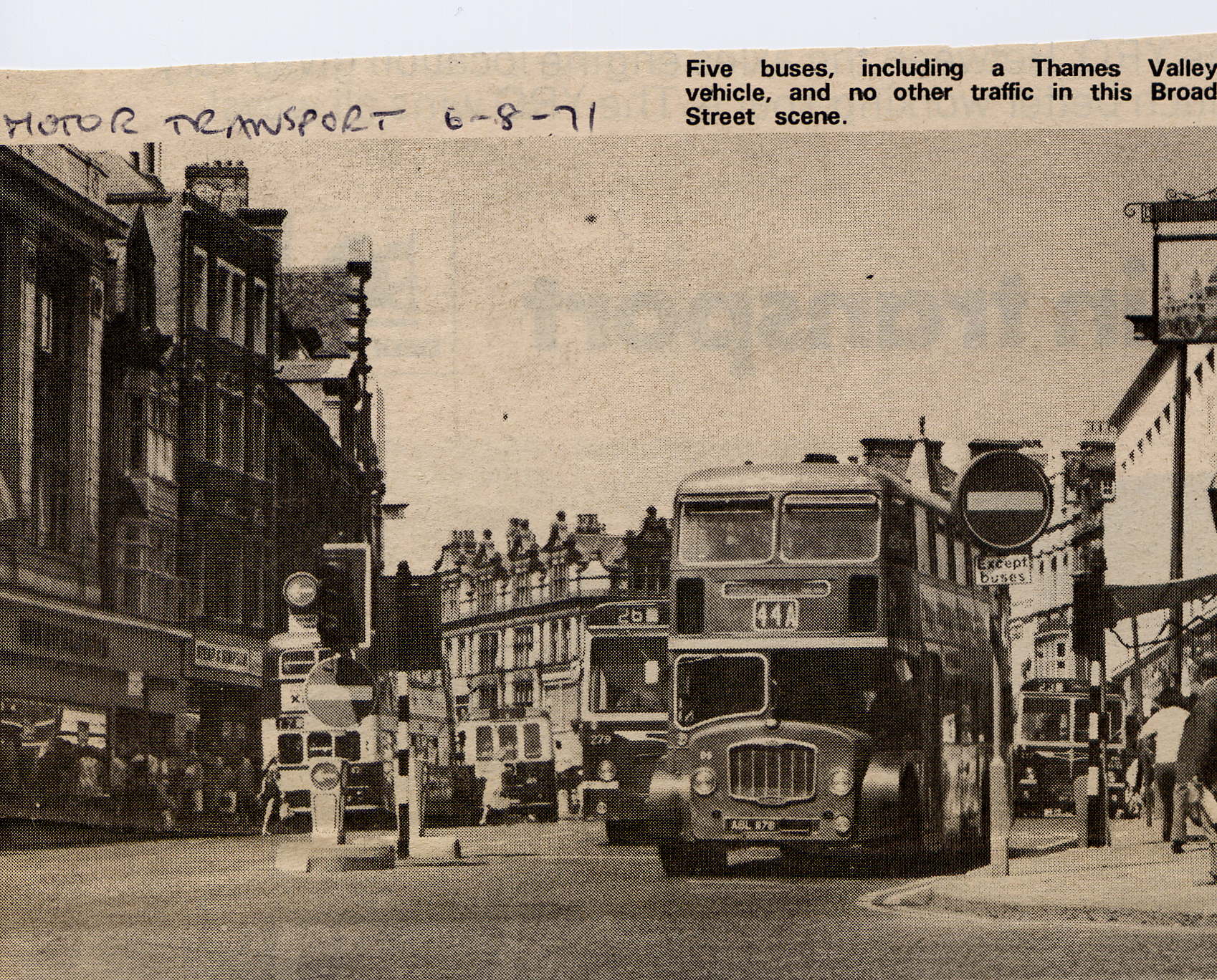 Still on the subject of pedestrianisation, Broad Street in Reading has been totally pedestrianised for years. However the first stage of change resulted in buses only. I have attached a press cutting from Motor Transport dated August 1971 which shows Broad Street in its buses only state. The lead bus is Thames Valley D5 (ABL 117B) a Bristol FLF on service 44A to Woodley. It is followed by Reading Transport 279, a Bristol RELL on service 26. There appears to be two more RELLs and a Dennis Loline in view.