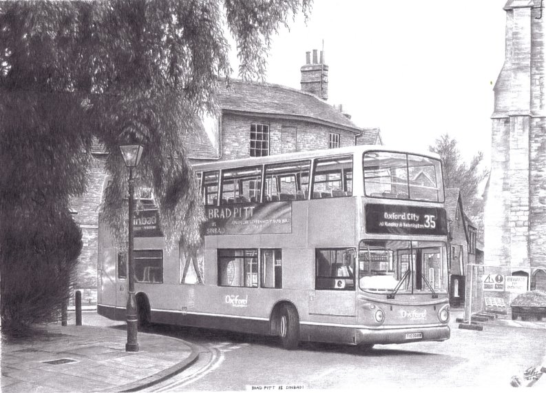 Steve Annells writes "Meantime I mentioned to you before before Christmas that a friend of mine, Mike Gardner, had made a drawing of red Oxford Trident 103 on 35A in 2003 from a photograph of mine. The image shows 103 turning by St Helen's Church during diversion for Abingdon's Runaway Fair. The attached scan (which you've seen before) is impressive; it's taken a while but I now have the A3 original and it is very good indeed, particularly as it's the first bus Mike's attempted - his speciality is hovercraft!