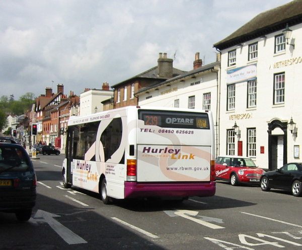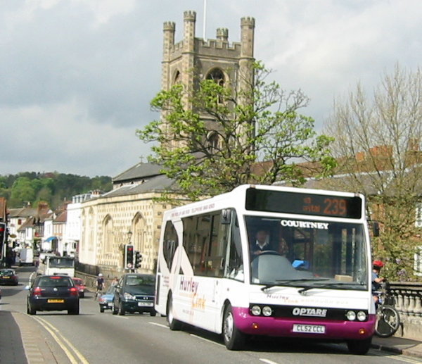 The last week has seen the end of the recent hot weather and a few rain showers. however still decent weather for photography and so I made a tour of the area last Saturday. Leaving Marlow, I ran along the Thames to Henley little appreciating that I was in for a nice surprise, a recently introduced route- the Borough Bus 239 - Henley Link. This service is operated by Courtney Coaches of Bracknell using a recently delivered Optare Solo. Fares on this service are very reasonable for a 45 min run, being £2 from Henley to Maidenhead. Whilst in Henley I saw that the council had completed the part pedestrianisation of part of the main street which leads up to Henley town Hall. This is where the Thames Travel starts their town services, now renumbered 151-154. This group of routes was formerly operated by Chiltern Queens. I was able to see a 153 departing.