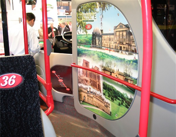 Using the Wright Eclipse Gemini as a base, Harrogate & District have packed in many novel features. The livery is very eye catching although one wonders how the silver vinyls will stand up to a daily bus wash. Also I could not help but wonder how much effort can be expended to keeping the livery pristine, with the possibility of broken windows and damaged panels.