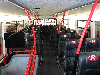 Everywhere the 36 motive is to be found, especially on seat headrests. In the lower saloon the seats are fabric covered but upstairs leather seats of a sumptuous design make a distinct impression on travellers. The use of TFT screens to give journey information is most useful and a great help to passengers, especially those unfamiliar with the route.