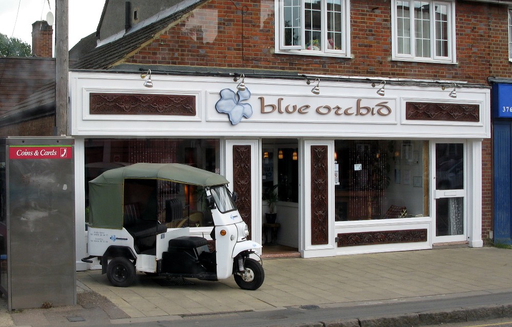 a Tuk Tuk, gracing the pavement outside the blue orchid restaurant. M