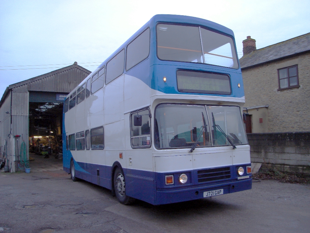 Andrew Dyer writes "I thought you would like a picture of Charlton-on-Otmoor services latest acquisition, Leyland Olympian J721 GAP. It is an 82 DP seated Alexander RL version. It was acquired from Stagecoach South (Fleet no 14971) on 4 December 2009. As I was visiting relatives in Oxford that weekend I delivered it and the picture is taken on the afternoon of delivery outside the garage at Charlton. As you will see, the Stagecoach red and orange have been painted out blue to give a quite smart two shades of blue and white livery suited to Charlton Services."