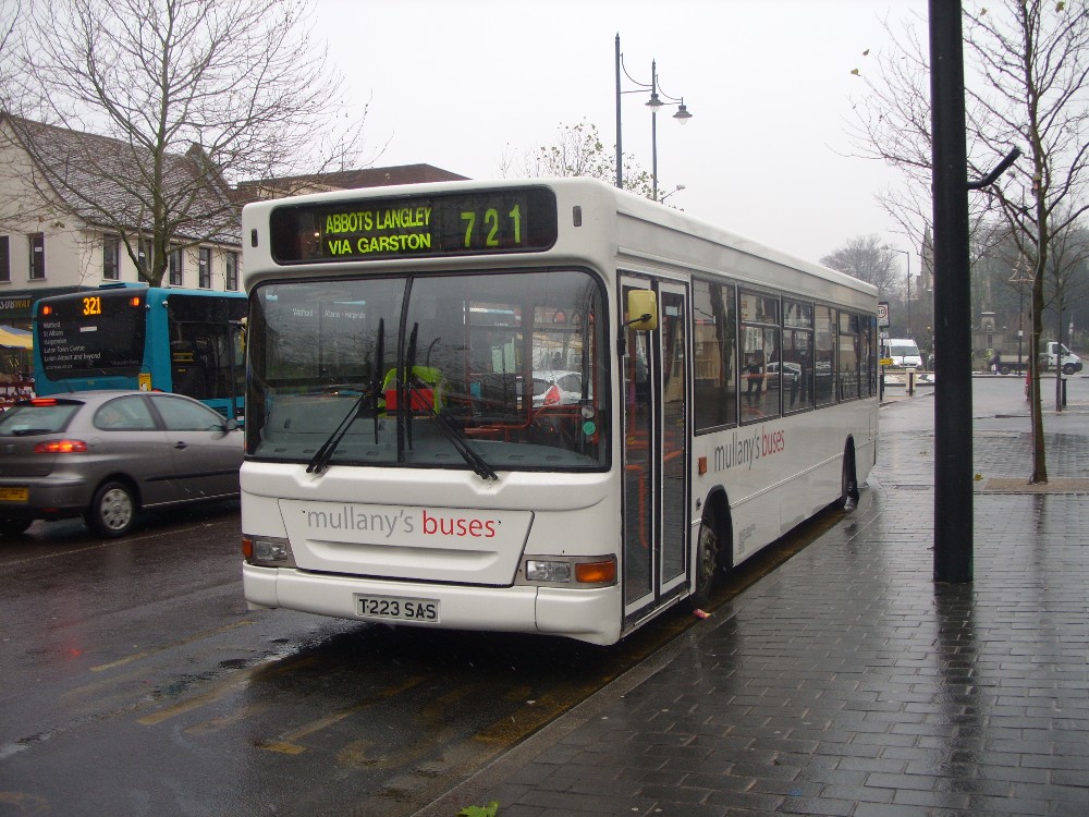 Andrew Morgan writes "Mullany's buses Plaxton Pointer Dennis Dart SLF T223 SAS parked in St. Albans today (16/12/09) on Wednesday only route 721 Abbots Langley - London Colney Sainsbury's .. makes a nice picture."