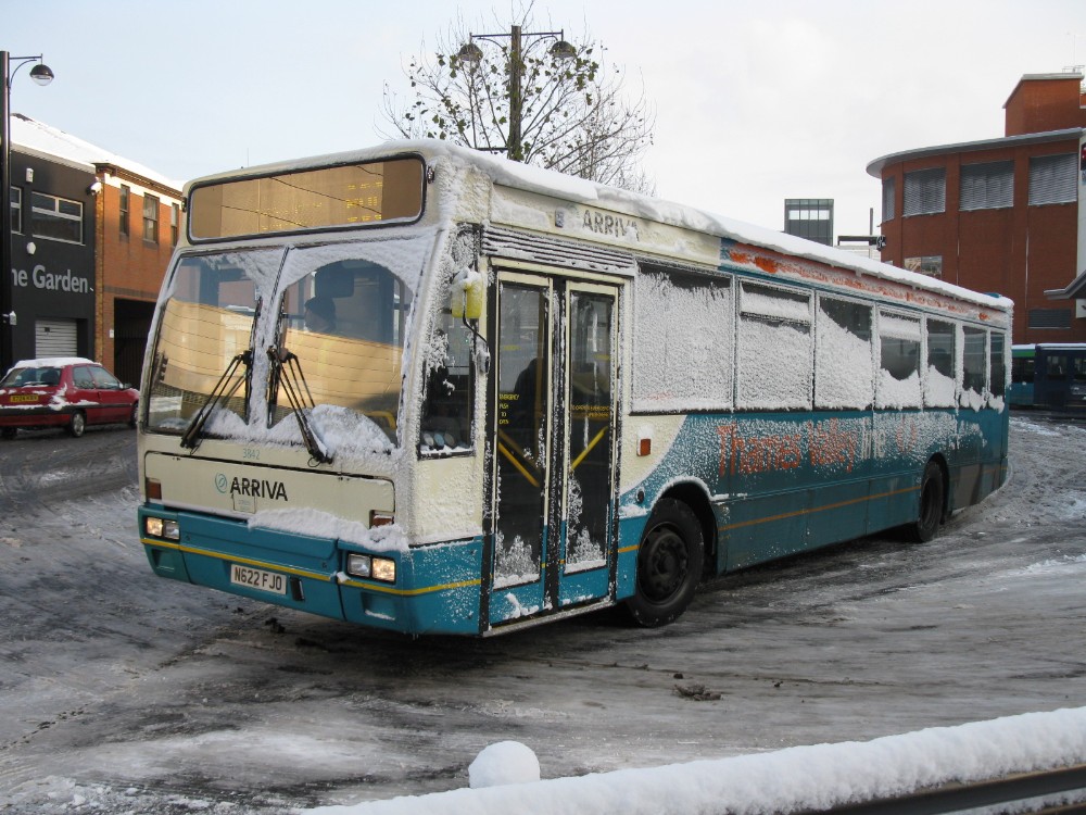 A snow covered Volvo B10B 3842 sets out for Marlow on the 800.