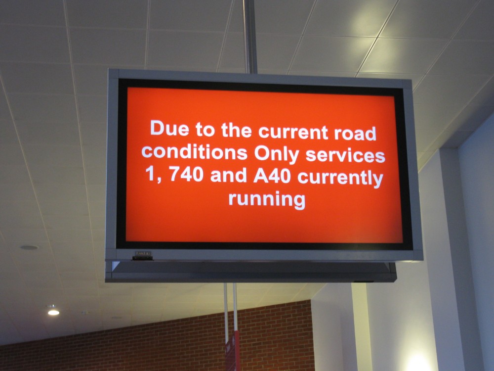 The passenger service information screens at Wycombe Bus Station at 0900 on