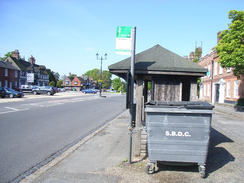 Dave Jackson wondered what had happened to the Beaconsfield [Old Town] London bound LT era wooden bus shelter? A regular Carousel A40 passenger informed me it had been hit by a vehicle [car?] and demolished ! Wonder what happened to the wheelie bin? Ed.