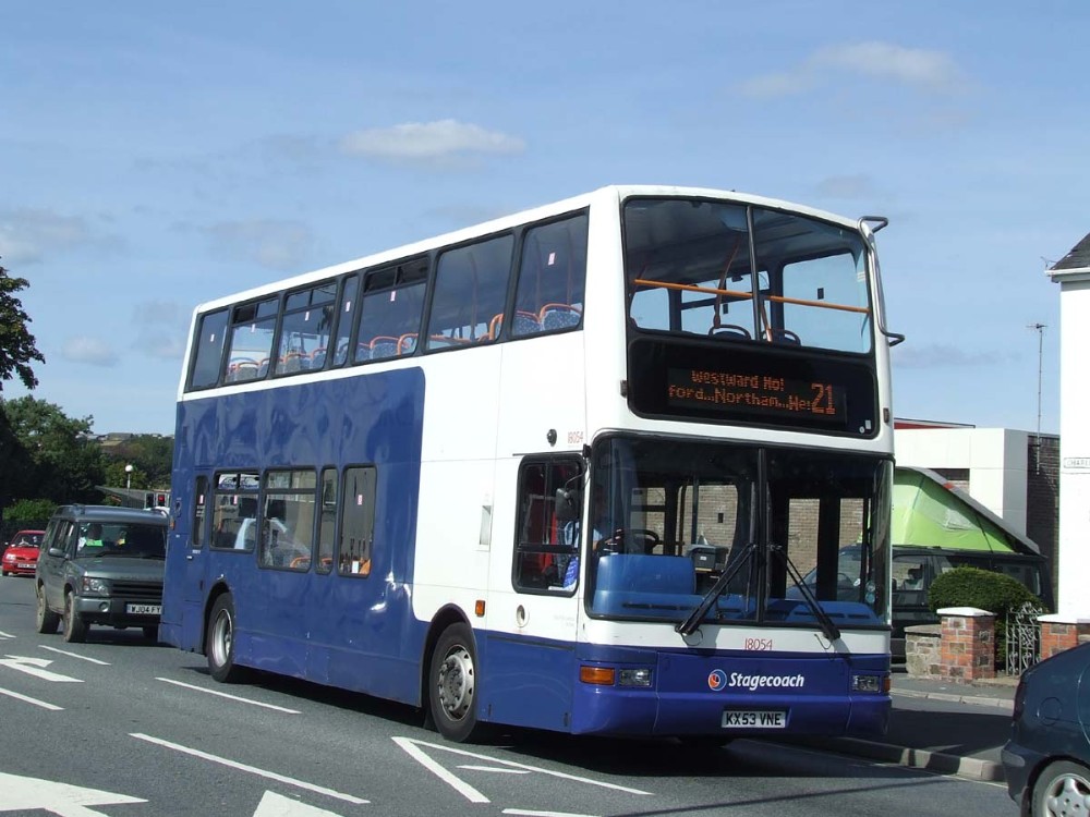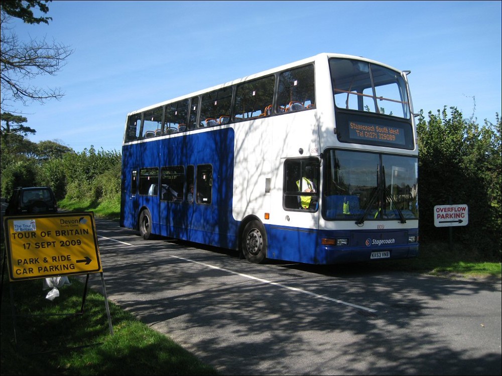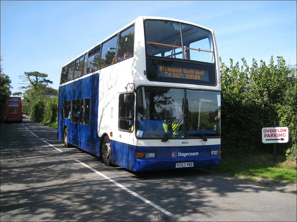 Dave Godley writes "With Bideford Quay closed for the Tour of Britain today the service buses were using The Pill again after a long absence. Brookes Buses 18051 & 18053 were in use on the Big Sheep P&R and 18054 was in use on the 21. There was a 4th Brooke Bus at Barnstaple but it was out of service with a broken window.