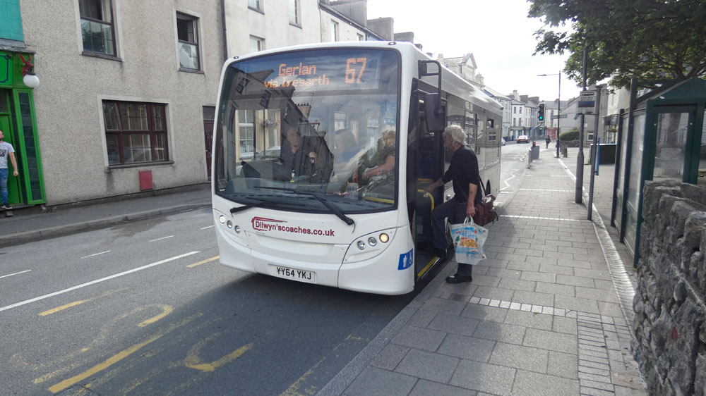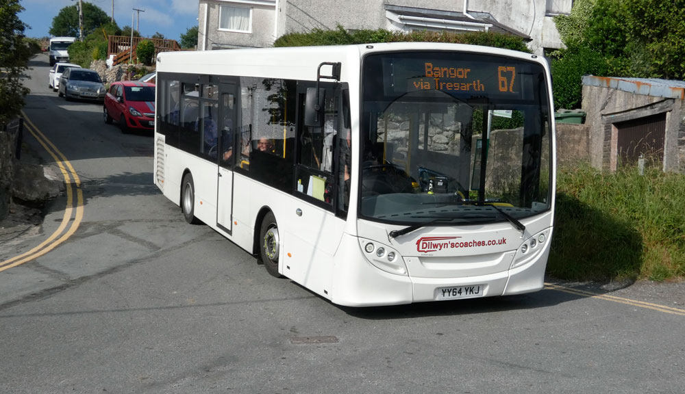 I took the opportunity to ride on the 67 from Bangor to Gerlan on Sunday, July 14th with Dilwyn driving. The route takes many narrow roads to the north and south of the A5 on its way to Gerlan which is just beyond Bethesda, once the home of Purple Motors. You can see the route of the service at the link below.