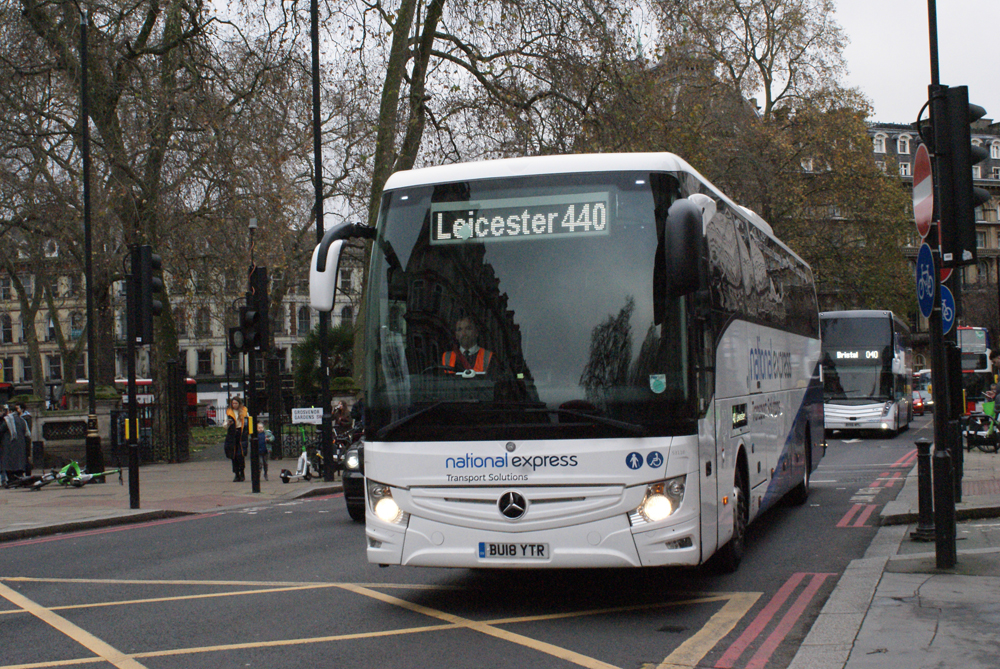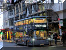 The lights are apparent as the bus loads at Trafalgar Square later the