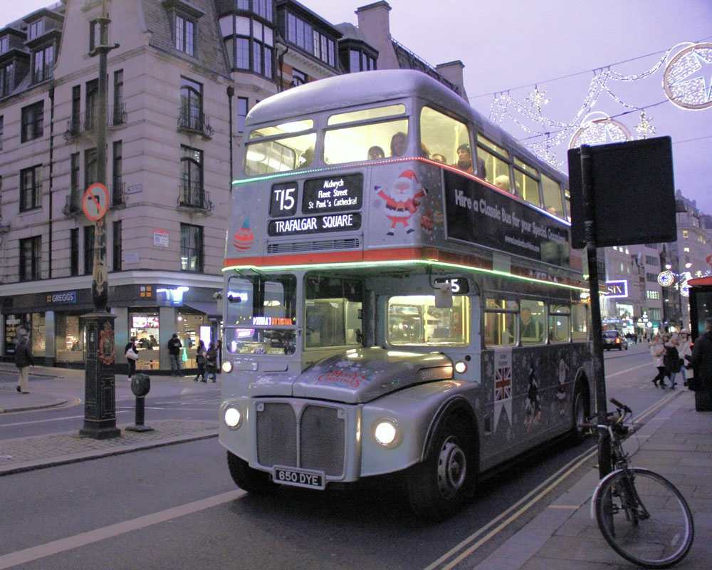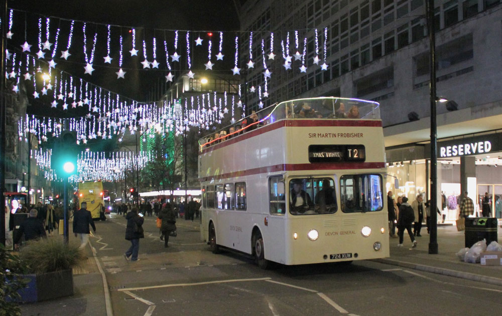 (1) Former Devon General 'Seadog' Atlantean 927 (724 XUW) Sir Martin Frobisher is on loan to Londoner Buses until the end of the year for their evening Christmas Light Tours, viewed in Oxford Street on Friday 15 December.