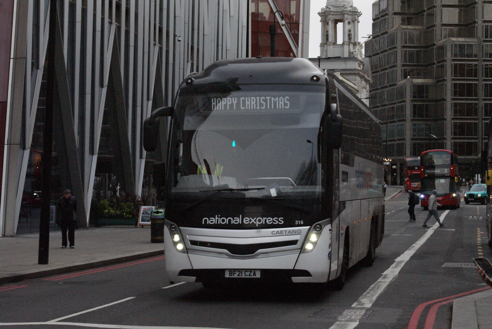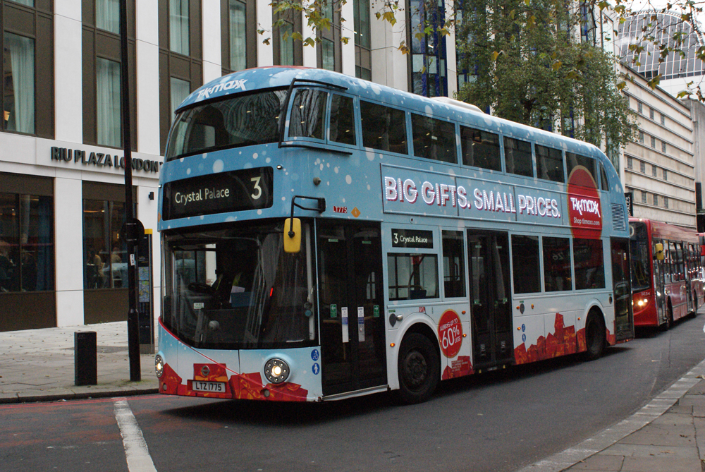 Christmas embellishments) seen in The Strand on Londoner Buses operated