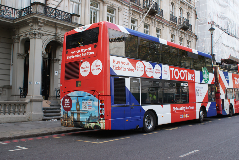 Sightseeing buses are also used for wrap advertising and RATP VXE 725