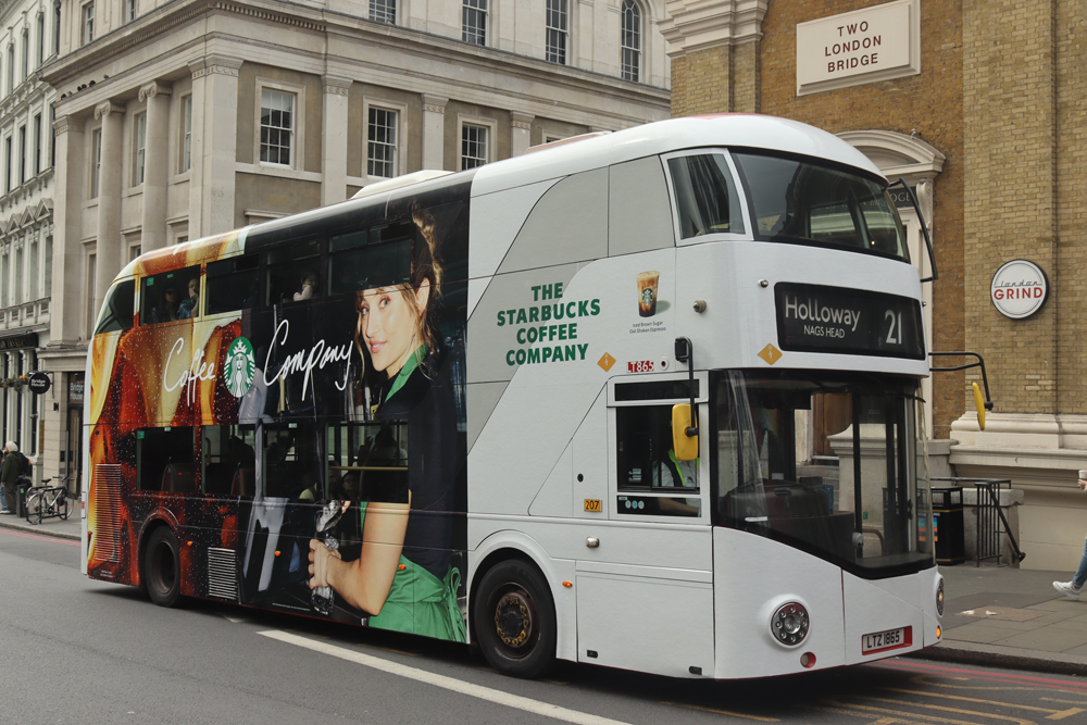 Drinks and fashion are the themes for the latest overall adverts to appear on buses across London.