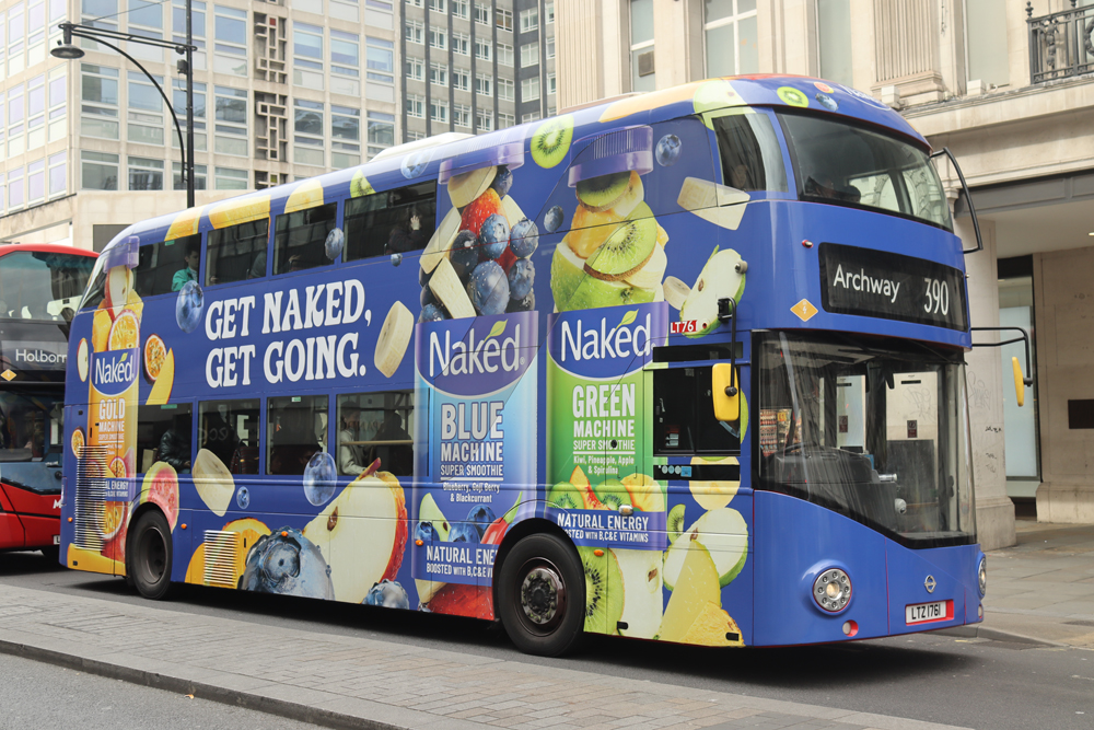 at Oxford Circus on 22 March, carries an advert for Naked smoothies.