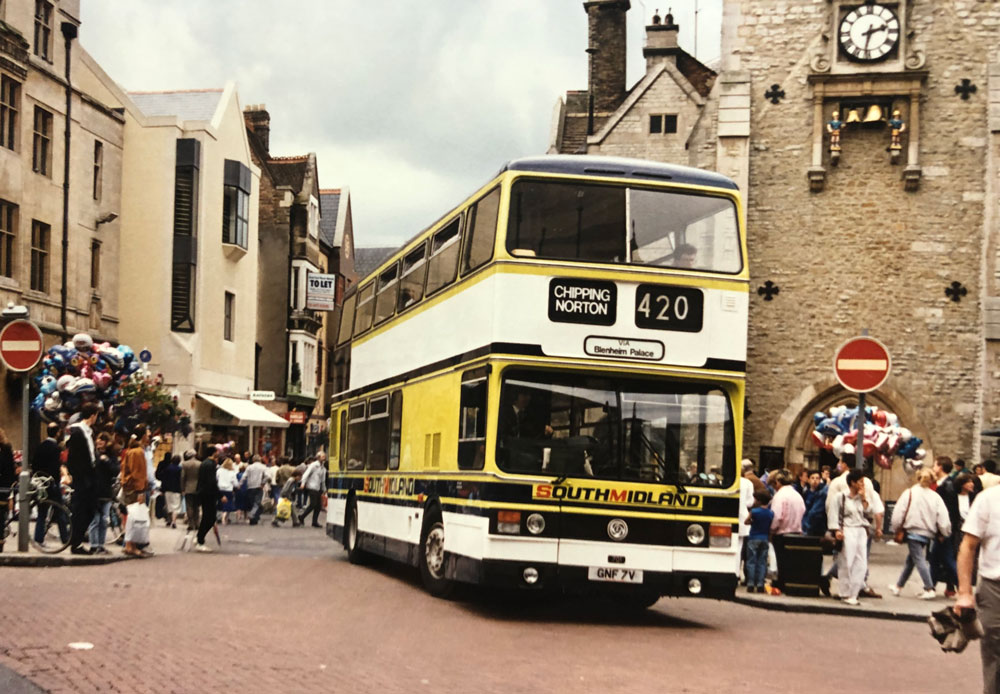 One of a batch of fifteen supplied to Greater Manchester Transport. New in November 1979 numbered 4007, it passed with another five to South Midland in 1987, It is seen above at Carfax, Oxford late 1988. South Midland was formed from part of City of Oxford Motor Services on June 17th 1984 with a management buyout being made on December 19th 1986. They were bought by Harry Blundred's Thames Transit in 1988.