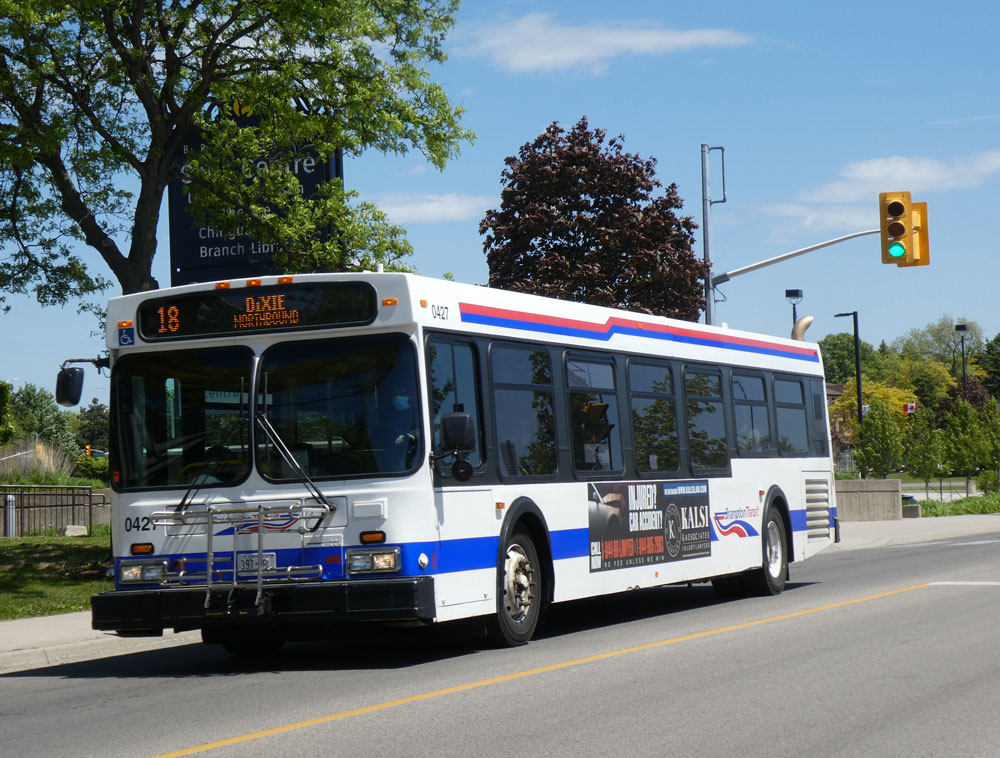 Older buses continue in service as shown by 0427, New Flyer D40LF, on route