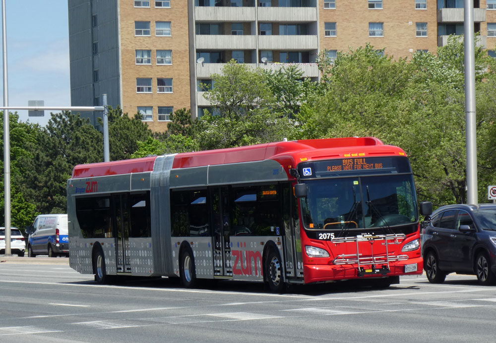 2075, New Flyer XDE60, was captured on Queen Street West on Zum route 501 as