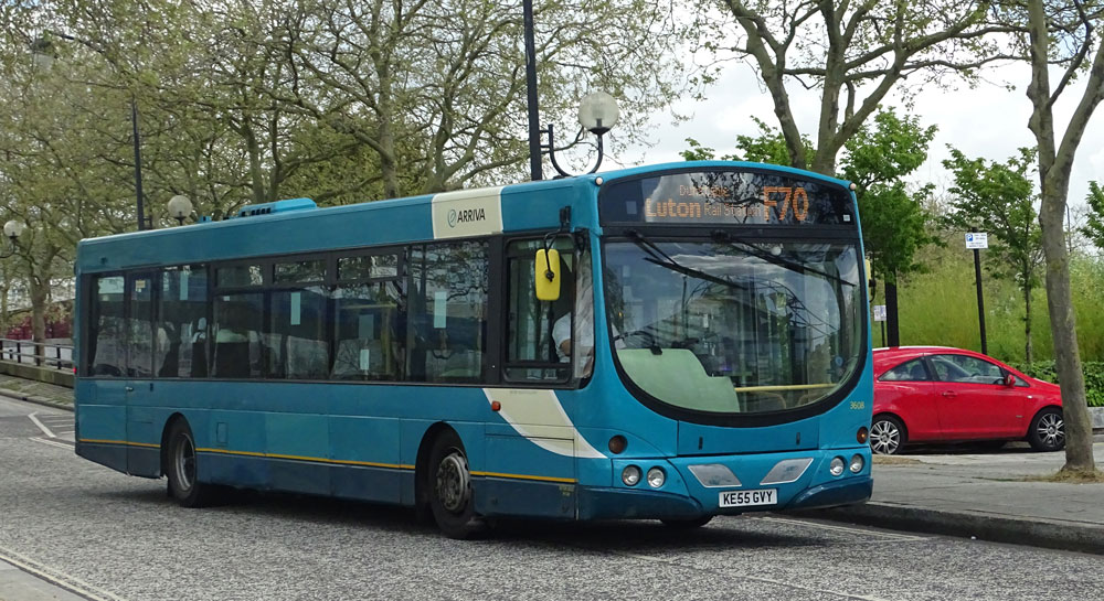 Wrights 3608 is seen with an F70 to Luton leaving MK.