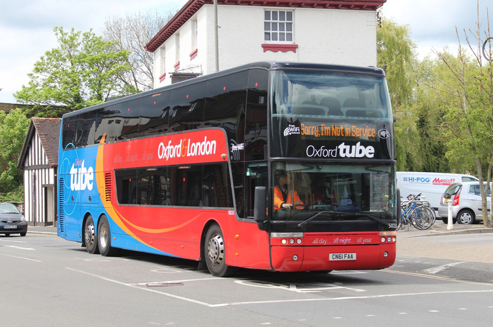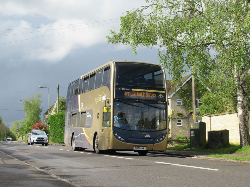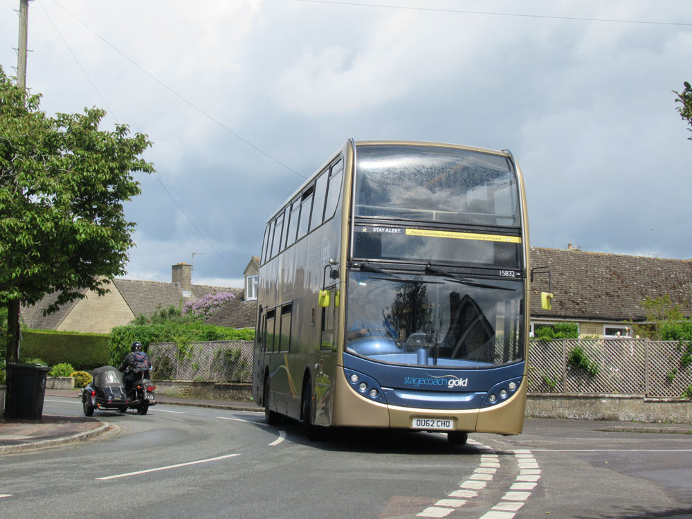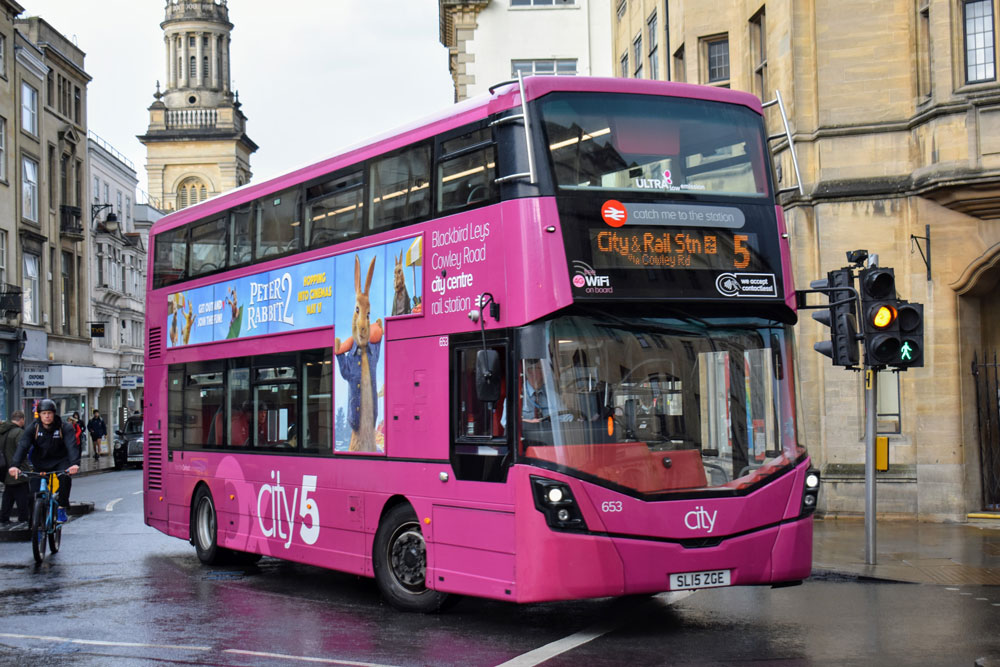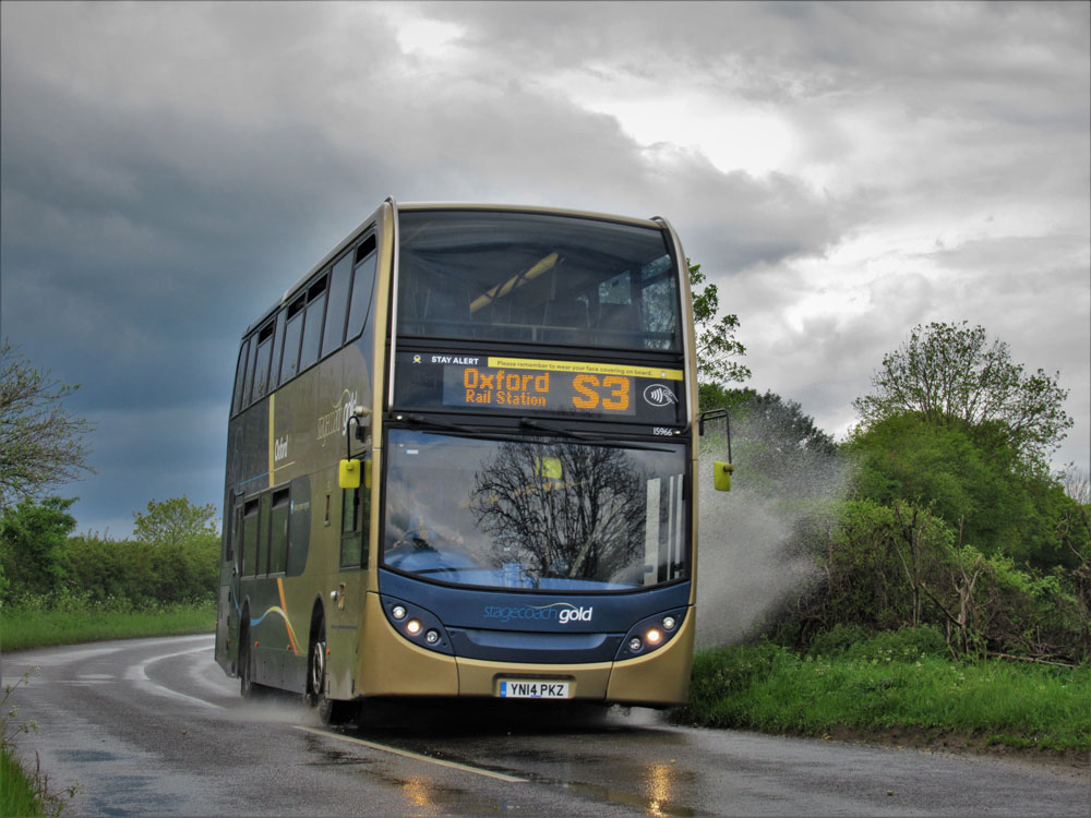 StreetDeck 653 in 5 livery turns at Carfax Corner, the rain making reflections