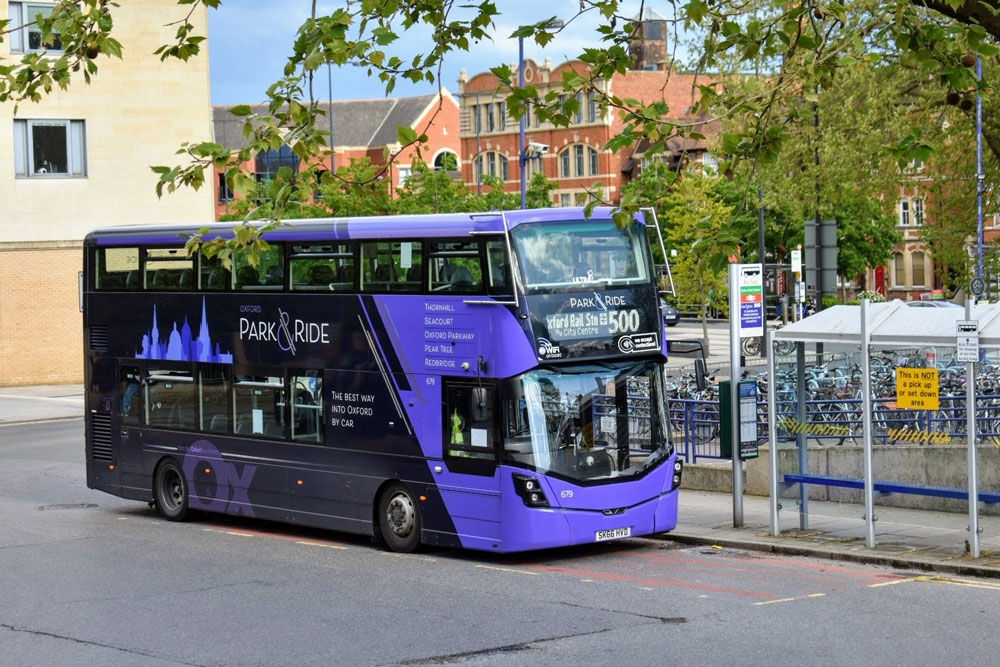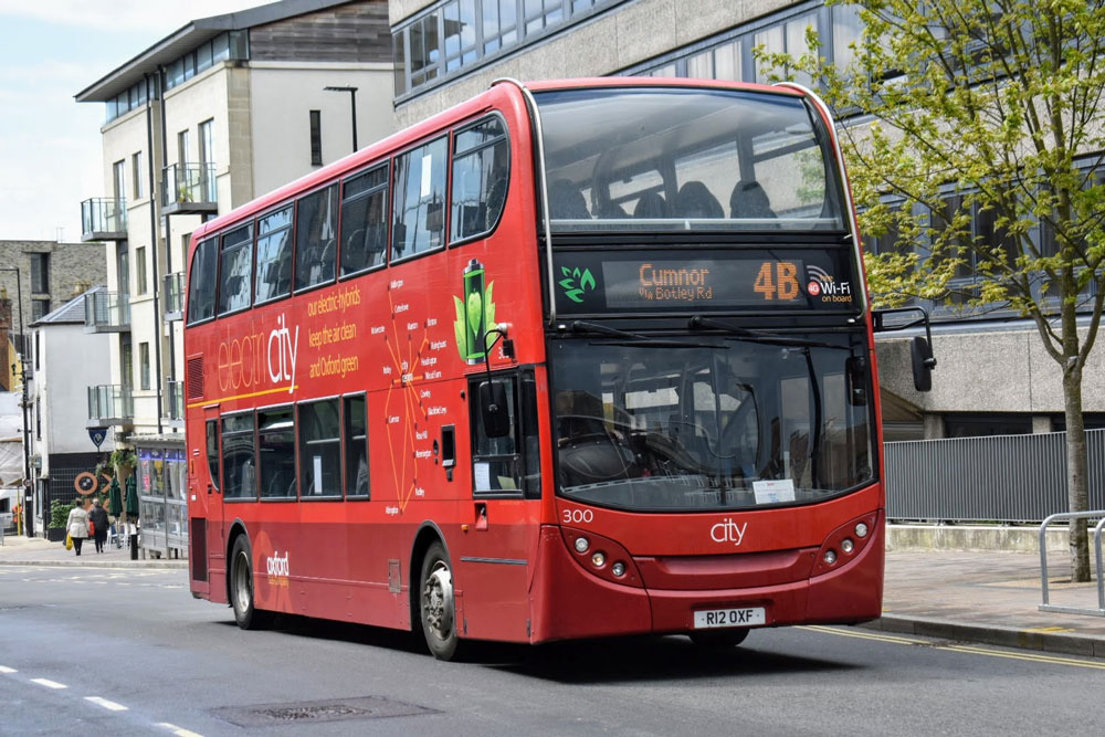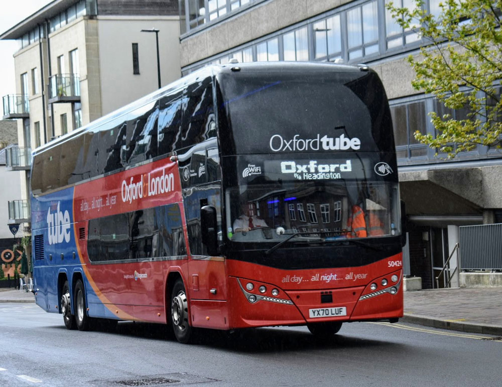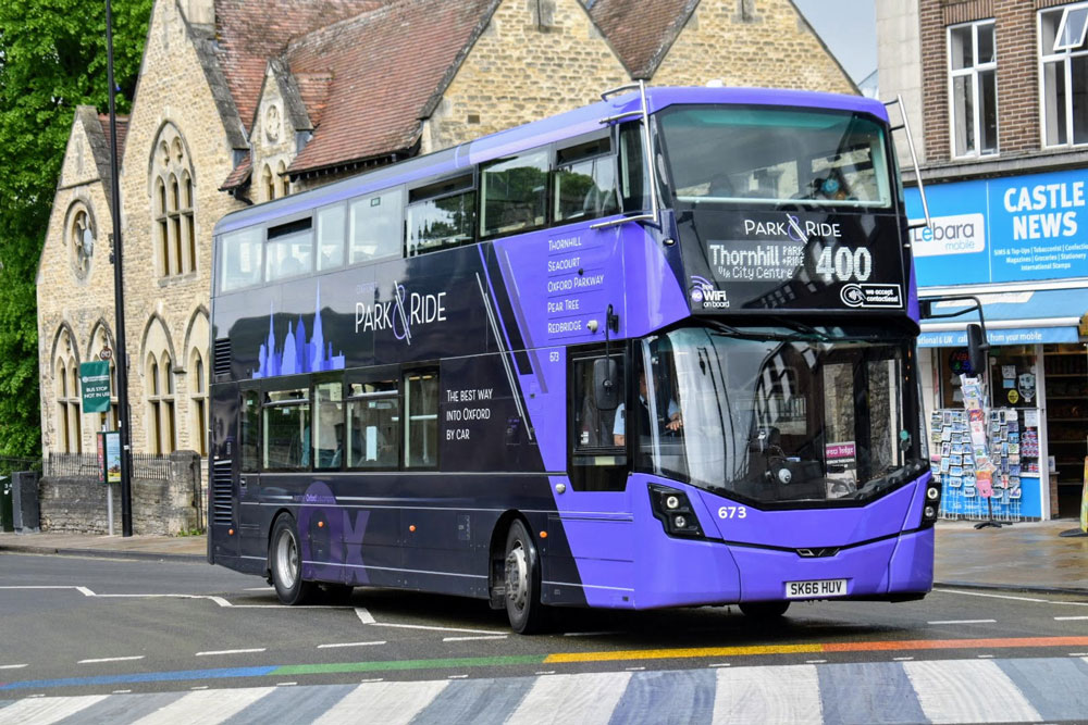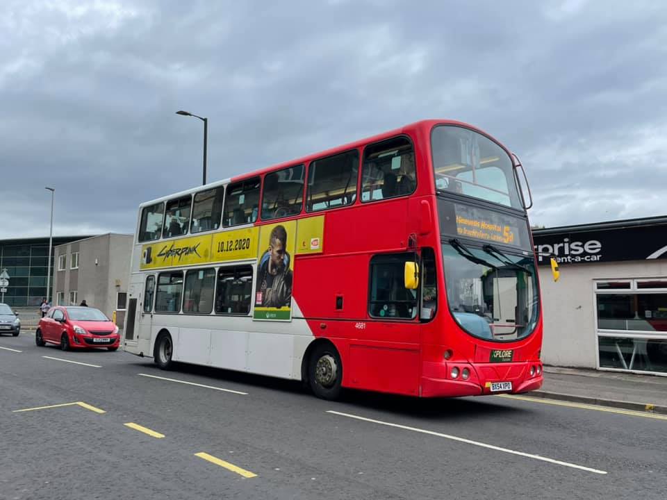 StreetDeck 653 in 5 livery turns at Carfax Corner, the rain making reflections