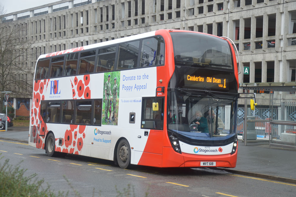 Stagecoach South 10775, WVT618, Alexander Dennis Enviro 400 in 'Poppy Appeal' livery.