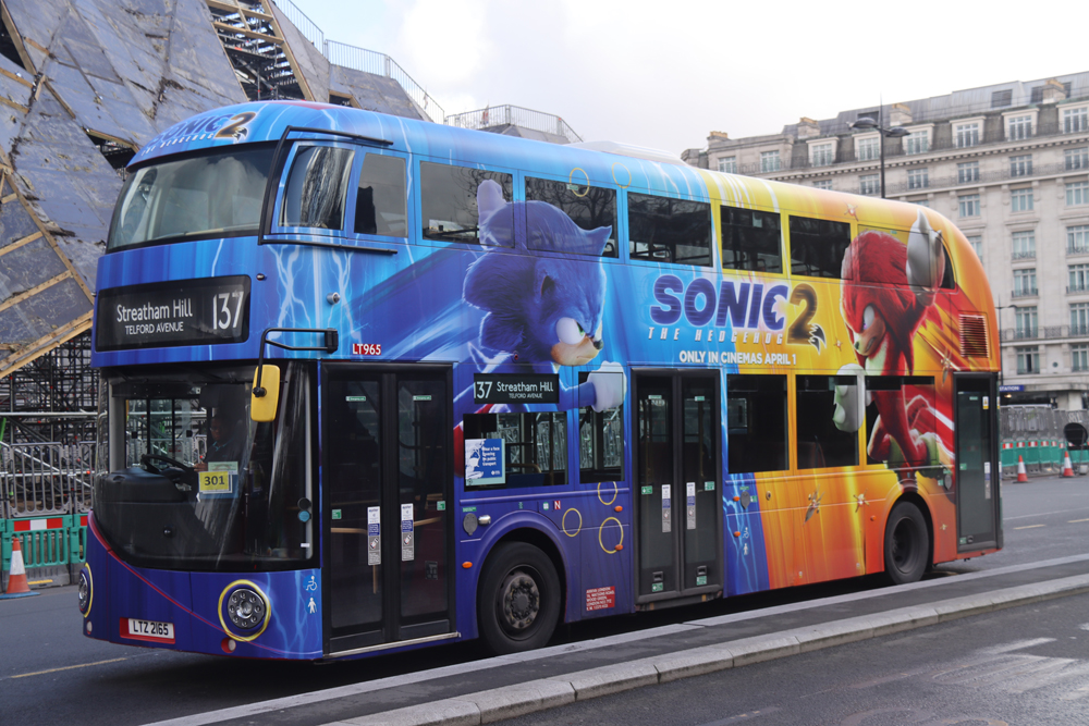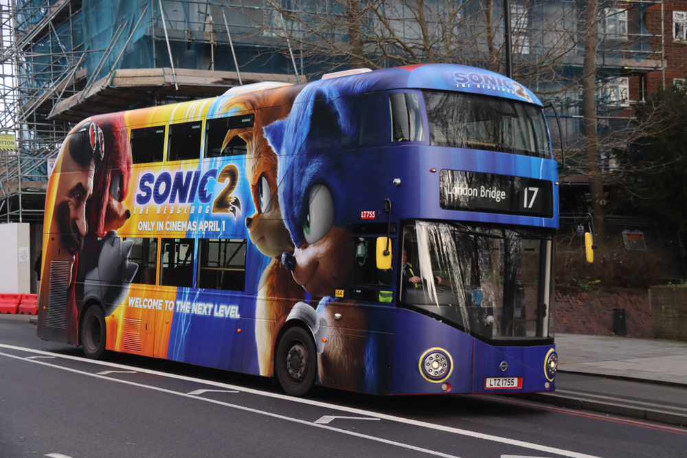The Sonic 2 movie, set for release on 1 April, is the subject of the latest all over advert campaign in London.