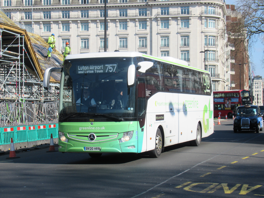 GreenLine livery adorns Tourismo 7213 passing the remains of The Mound at Marble