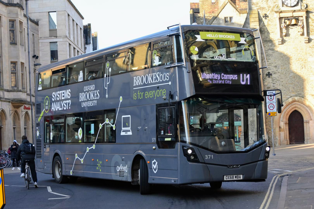 Brookes 371 with a U1 heading for Wheatley Campus passes Carfax Tower on March